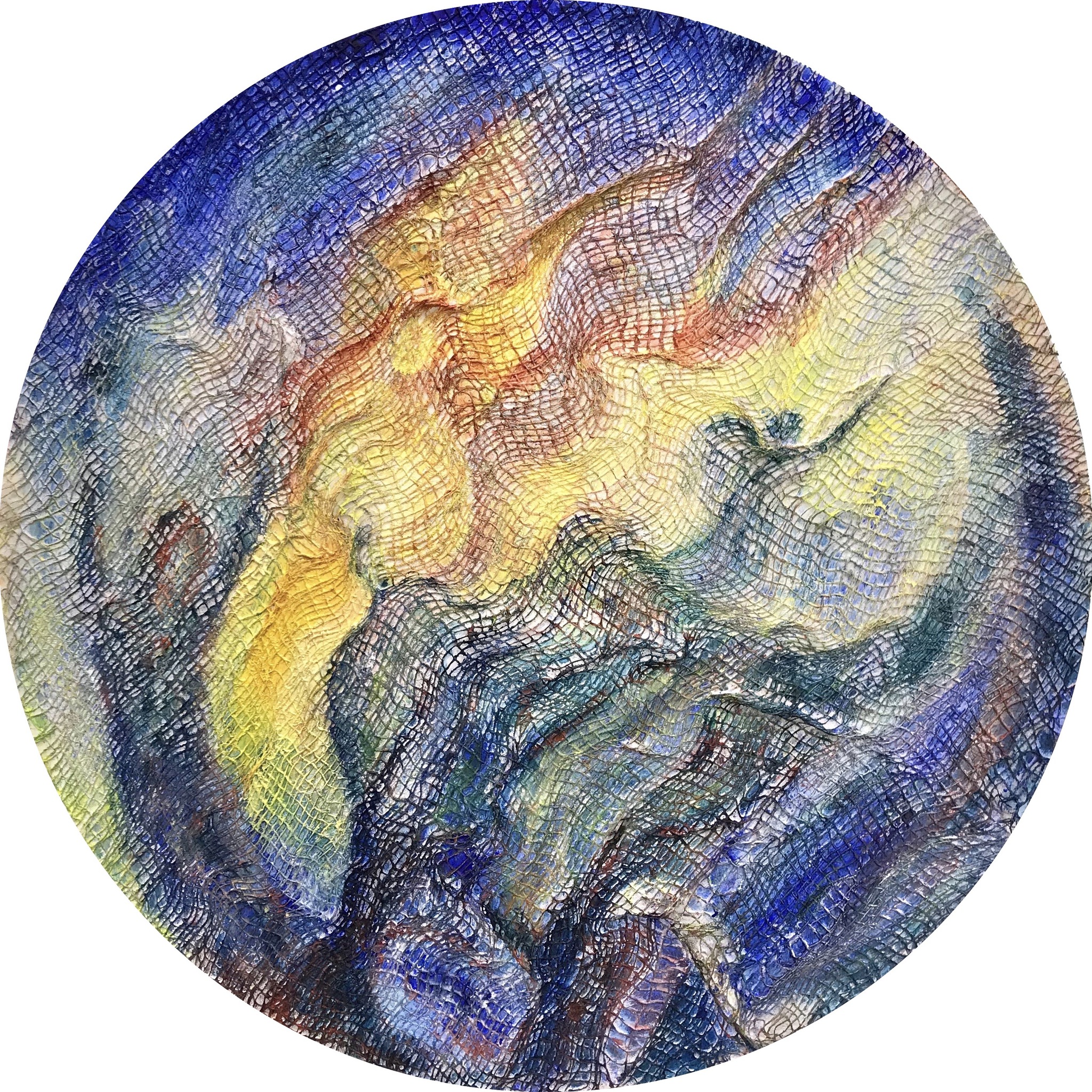 Een sage over na de strijd, op het slagveld, de walküre die de net gesneuvelde helden meeneemt na een ander oord ... Acrylverf op jute op dibond, rond, doorsnee 75 cm