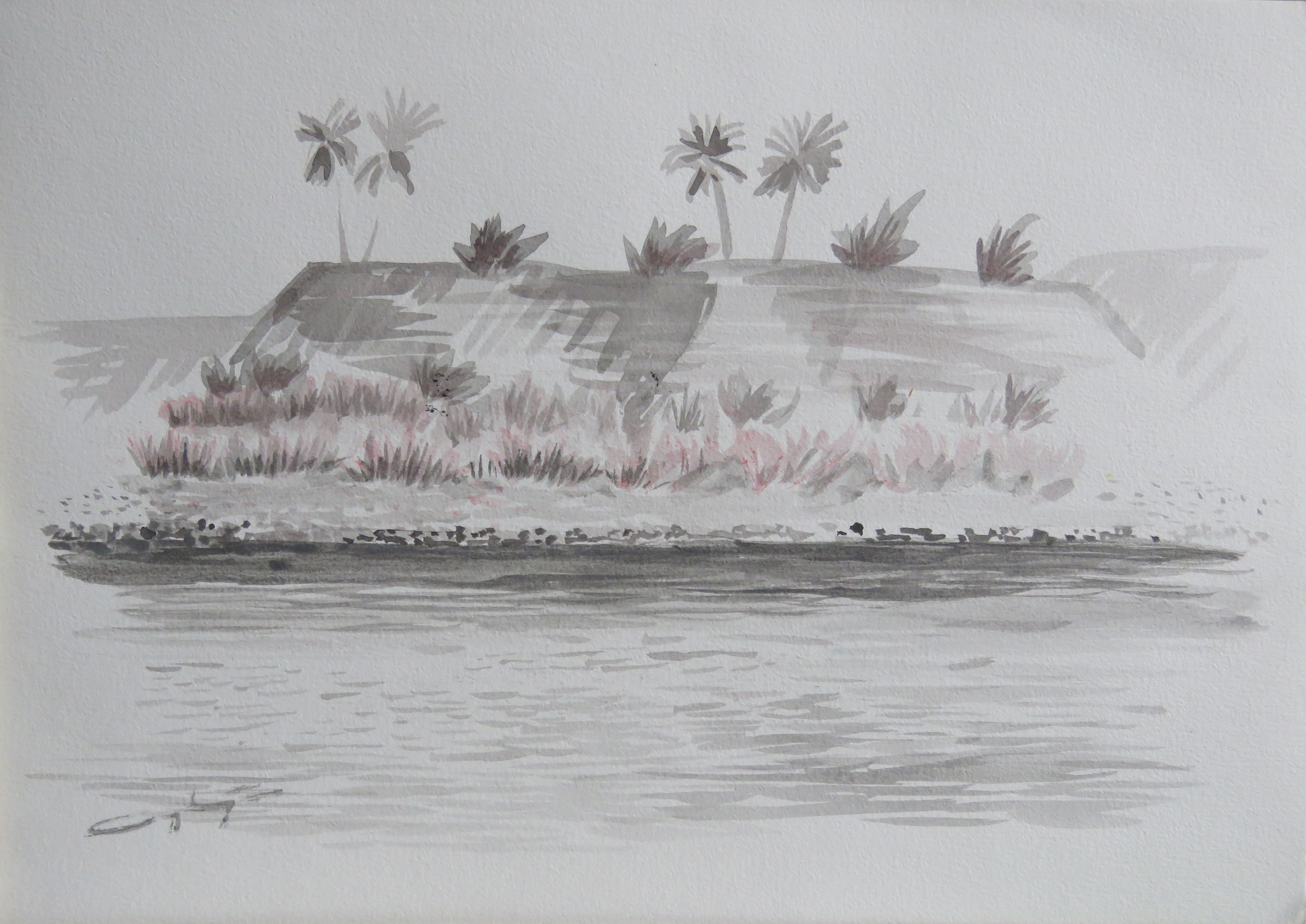 Zittend op de boot zat ik regelmatig met een schetsblok op schoot, terwijl we langs de vruchtbare oever voeren. Hier schetste ik hat landschap zoals het er veel uit zag.