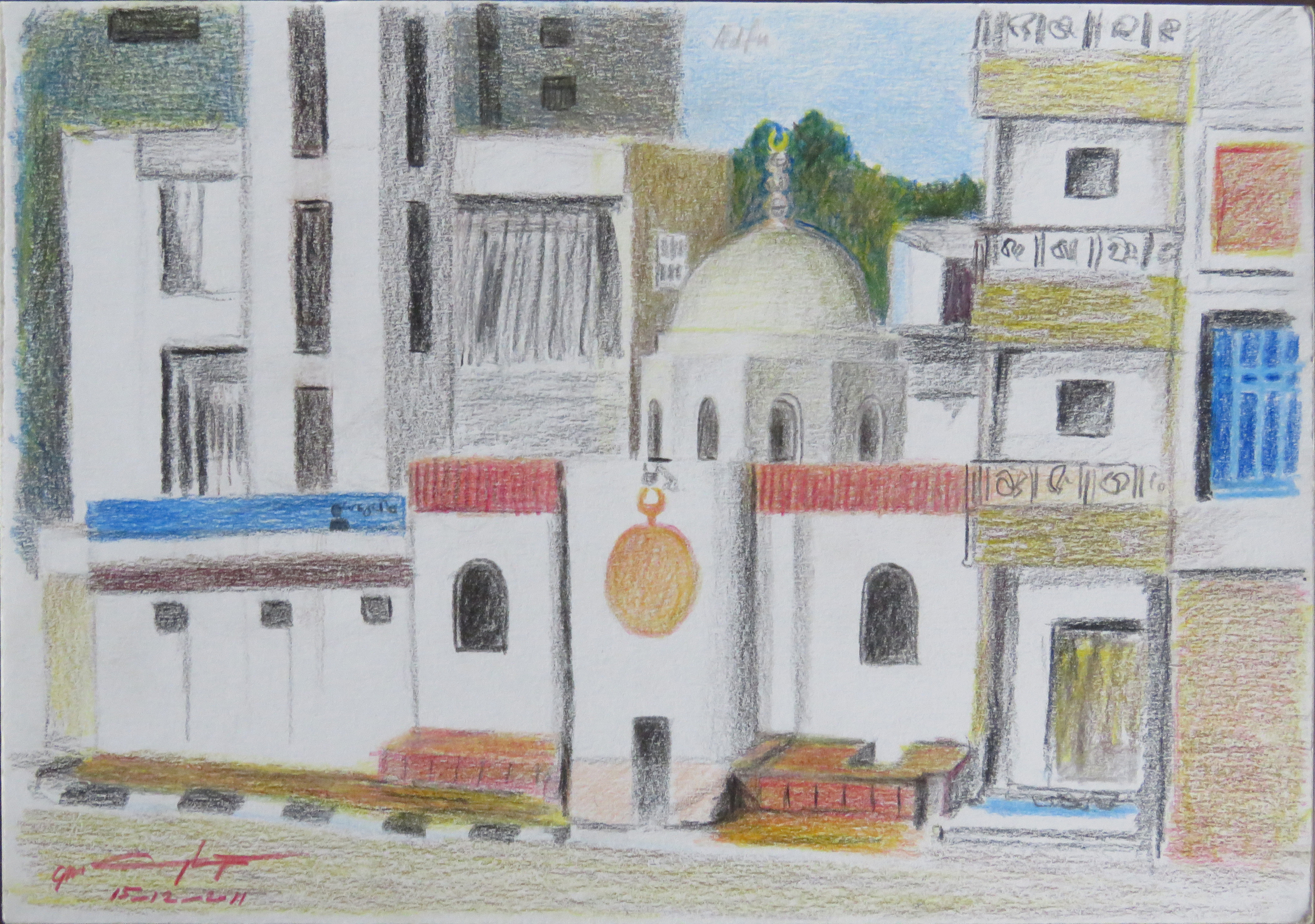 Toen lag de boot een tijdje stil, bij de stad Adfu. Tijd genoeg om de aantrekkelijke vlakjes van de huisen te tekenen en nu en dan de ronde vormen. In zachte tinten Passend bij de zonnige dagen.