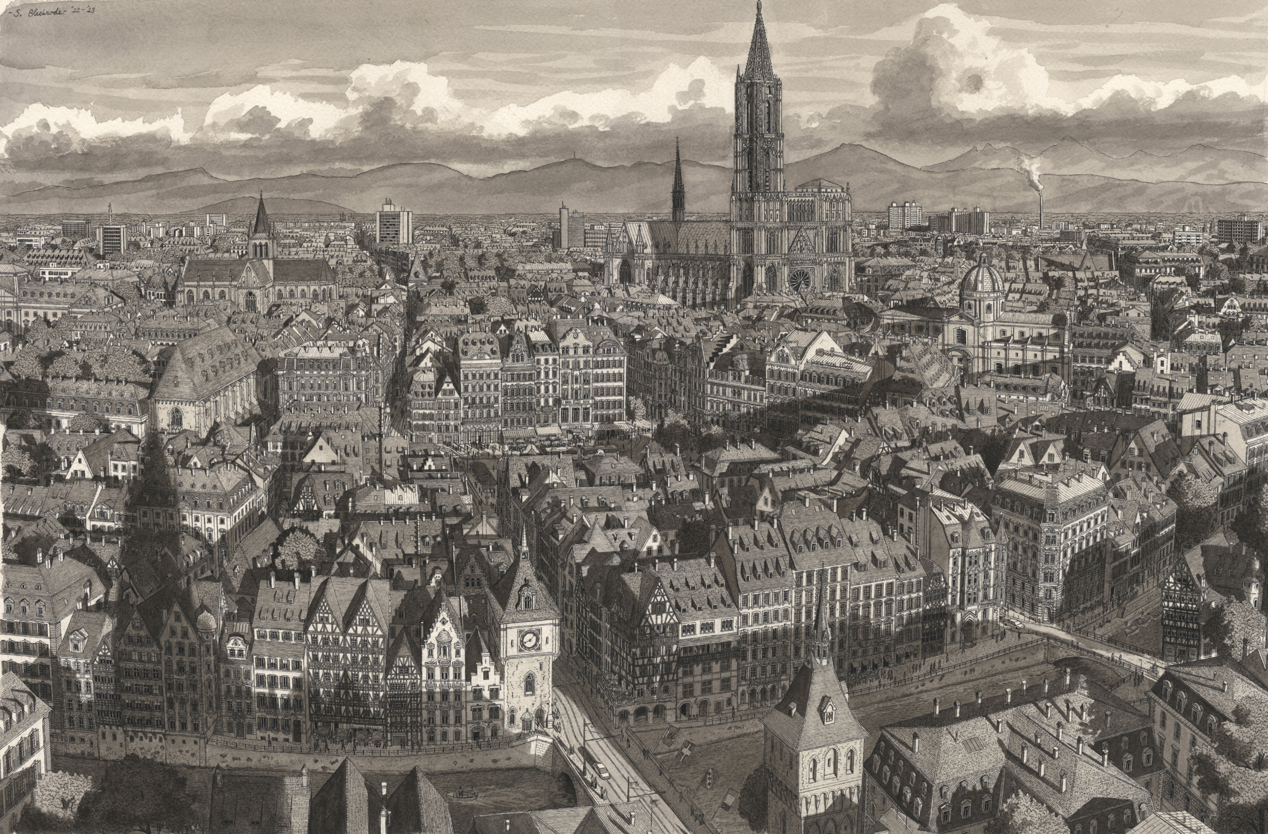 Gefascineerd door de vermenging van Franse en Duitse invloeden wat steden als Straatsburg en Colmar zo kenmerkt, heb ik een eigen invulling gegeven aan aan dit thema met deze imaginaire stad in de Elzas.