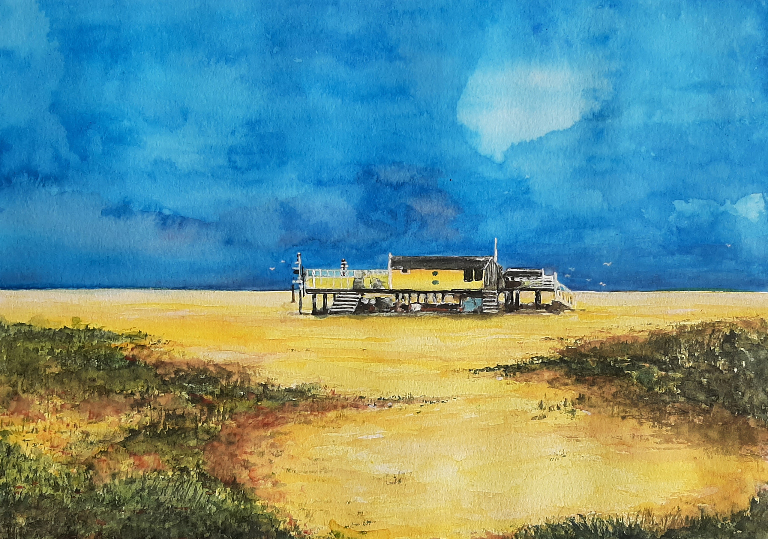 Van Lauwersoog naar Schiermonnikoog. Vanuit de verte zie je het eiland meer vorm krijgen. Je gaat aan land (we hebben de fiets bij ons, want het eiland is autoluw) en voelt je al snel thuis. Een soort ongrijpbare magie komt over je. In september 2022 zijn we er voor het eerst. In mijn dagboek noteer ik: De schelpenpaden glimmen in de zon. In het algemeen zijn ze flink aangestampt en dus goed te befietsen. Op een aantal plekken, vooral als het pad omhoog loopt, is het schelpengrit door regenbuien naar beneden gestroomd. Het gevolg is een helling van los zand, rul en te slecht om naar boven te fietsen. Maar daar hebben ze hier wat op gevonden: hooi. Dat over de hele breedte en lengte van het pad is uitgestrooid. Maar het belangrijkste: het fietst lekker over zo’n hooipad. Weinig andere fietsers nog. Dus de pedalen gaan relaxt rond op het Bospad, het Westerhofpad, het Jacobspad of hoe al die paden ook mogen heten. Jacobspad? Opnieuw een stukje van de Camino naar Santiago de Compostela gefietst. Even ben ik terug in 2010 en 2012. Daar waren hetere vuren dan hier. De oversteek van de Franse Pyreneeën. Cruz de Ferro. O Cebreiro. Bloed zweet en tranen. Maar hier op Schiermonnikoog gaat alles met twee vingers in de neus. Doe mij maar een hooipad. Het aquarel laat het strand bij Paal 3 zien. Als we er rondlopen staat er een strakblauwe lucht en is het er aangenaam warm.