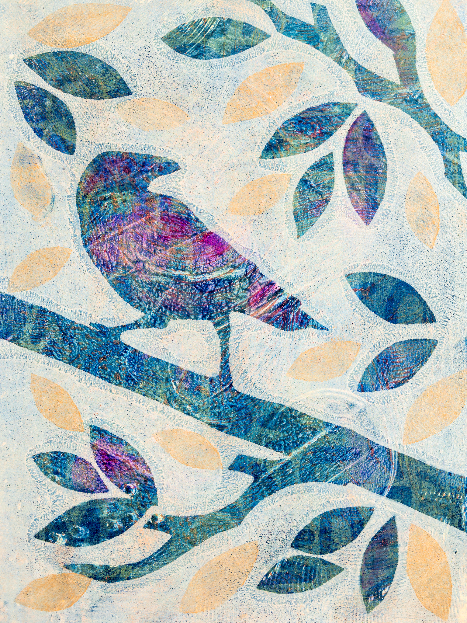 Abstract Vogel Blauw Blad Monoprint