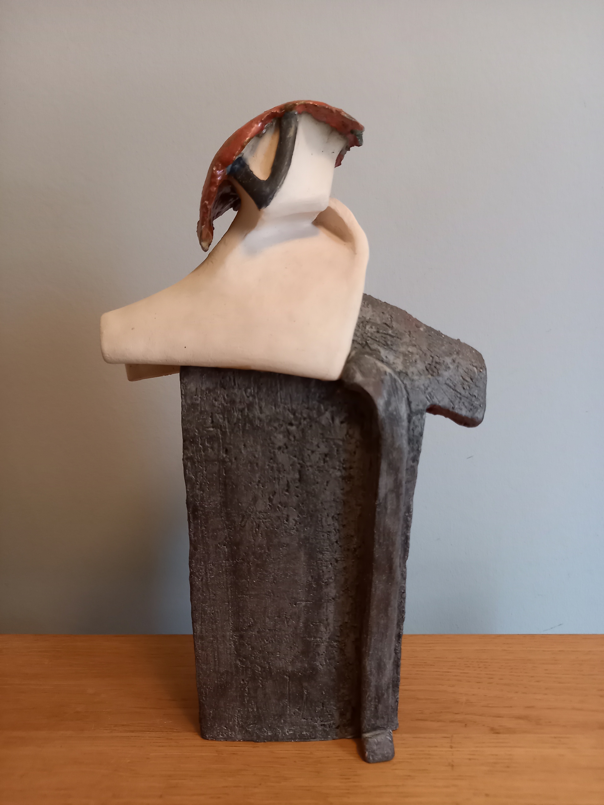 Een abstracte figuur wordt met de toevoeging van een gemaskerde buste tot leven gewekt.