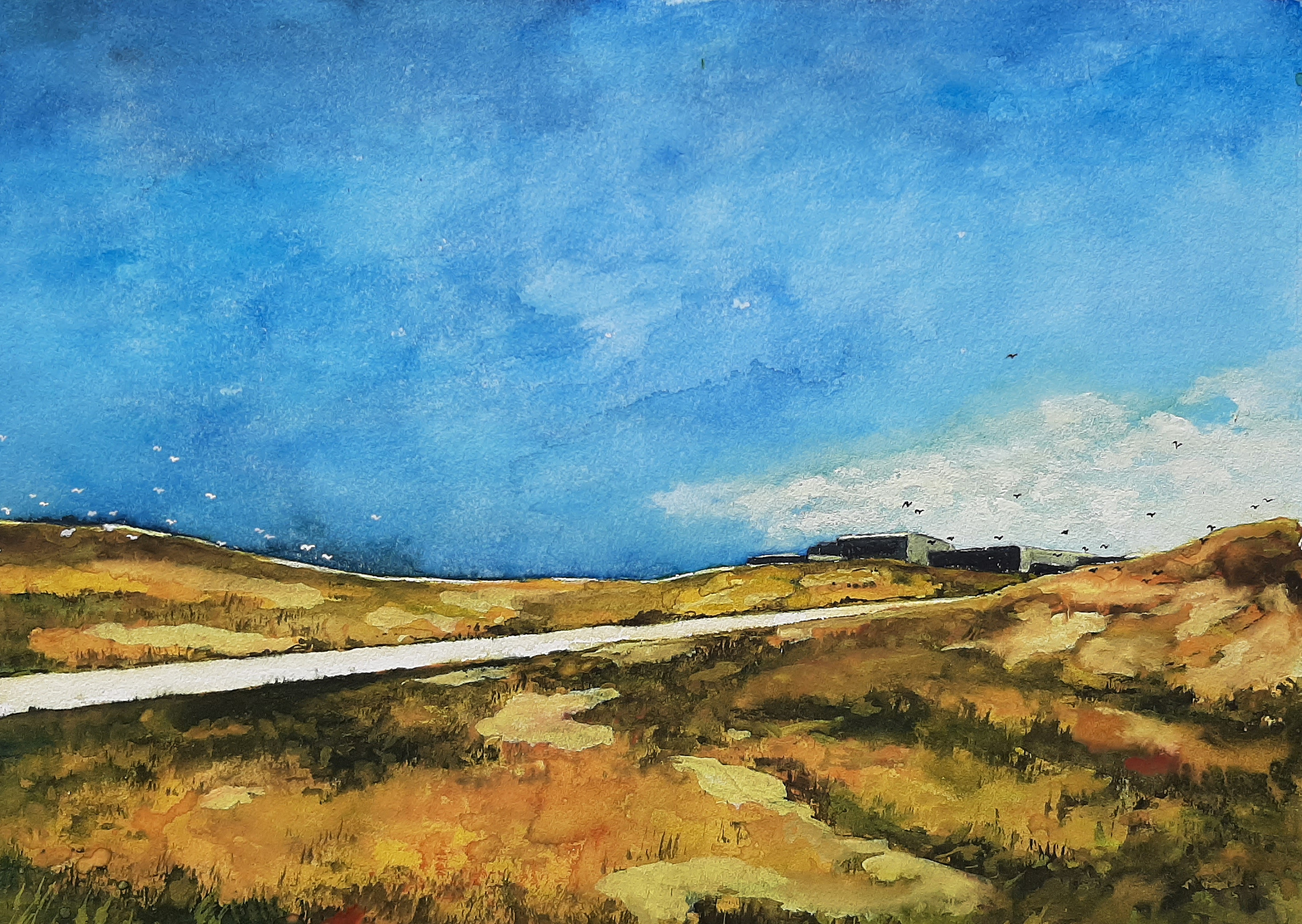 In september 2022 zijn we voor het eerst op Schiermonnikoog. Schiermonnikoog is niet alleen een paradijs, maar ook een schilderparadijs. Thuisgekomen grijp ik onmiddellijk met aquarelpenseeel. Het wordt een duinlandschap. Met zicht op de vuurtoren. In mijn dagboek van 7 september 2022 schrijf ik o.a. het volgende: Het oog valt op de bunker Wassermann, in de verte al zichtbaar, hoog in het duin. Opnieuw Duits erfgoed. De megabunker werd in 1943 op Schiermonnikoog gebouwd. En, zoals zovele bunkers, de tand des tijd grandioos doorstaan. Maar de door de Duitsers geplande radar op de bunker is nooit gerealiseerd. De bunker vormde een kleine schakel in de Atlantikwall, de Duitse vestinglinie die liep van Noorwegen tot de Spaanse grens. We fietsen over de Prins Bernhardweg richting bunker, destijds gebouwd door de Duitse Organisation Todt. De Duitse bouwmaatschappij Organisation Todt gaf leiding aan de bouw van de Atlantikwall. De organisatie is genoemd naar Frits Todt, de Duitse minister van Bewapening en Munitie. Bij de bouw werkte de semimilitaire organisatie vaak met dwangarbeiders. A la Vladimir Poetin. Het aquarel is gemaakt op 300 grams Hahnemühle Cézanne papier