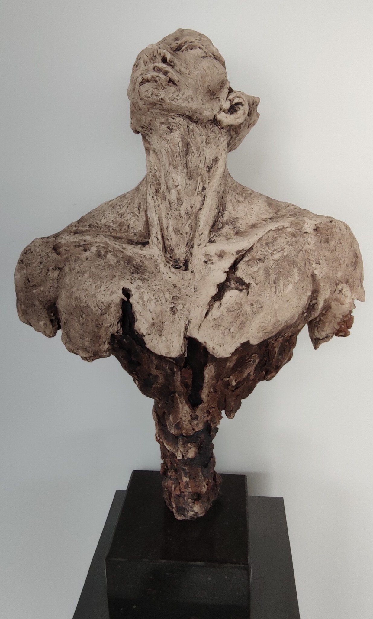 Dit beeld toont de mens in een moment van overgave en kracht. De verweerde huid, met zijn diepe scheuren en ruwe textuur, draagt de sporen van strijd en doorzettingsvermogen. Toch richt het hoofd zich omhoog — een gebaar van hoop, vertrouwen en verbinding met iets groters dan het eigen lijden. De brokkelige basis verankert hem in zijn verleden, terwijl de opwaartse blik de belofte draagt van licht, vrijheid en innerlijke groei.