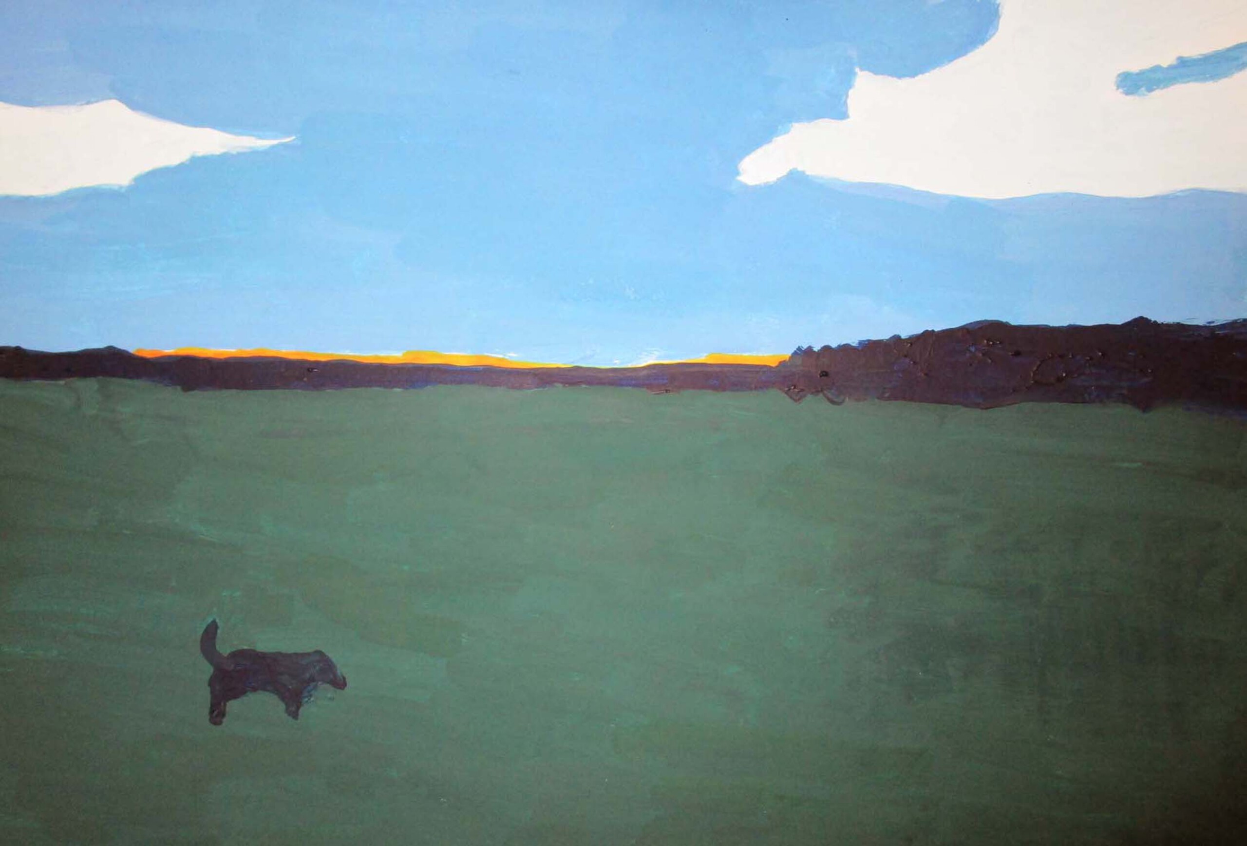 Wit Oranje Blauw Wolken Bomen Met Lucht Gras Hond Avondzon Groenlandschap
