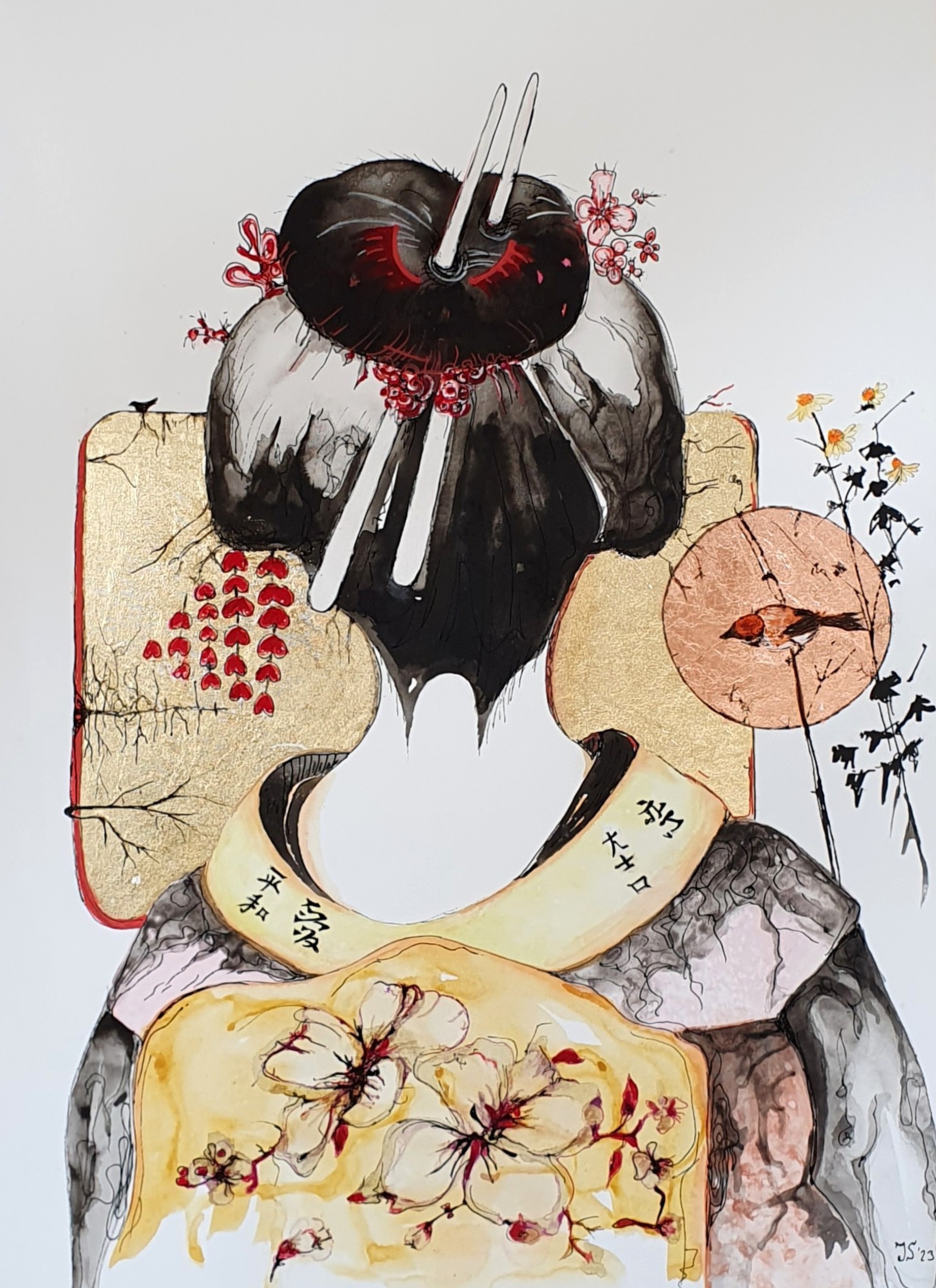 Japanse serie Achter aanzicht van een vrouw, met opgestoken haren.. met acrylinkt en ingetogen kleuren... Deze is via werkaandemuur.nl te koop..