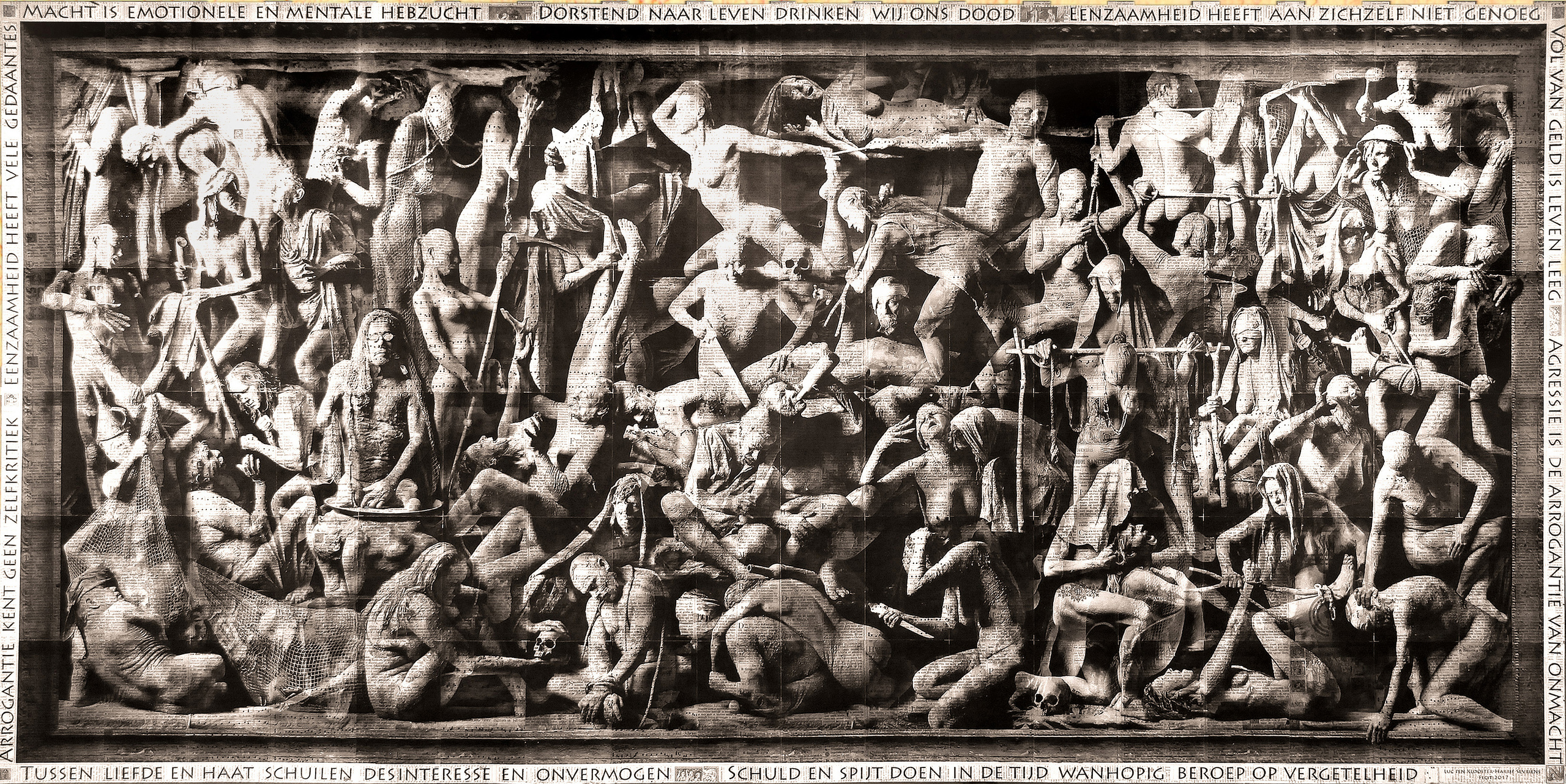 Vierde deel van 'Ecce Homo', een 10m breed vierluik in de vorm van grote papierbanieren. De teksten zijn van de in 2018 overleden Heerlense dichter en aforist Harrie Sevriens. De modellen, bedekt met leem, zijn apart gefotografeerd waarna het totale beeld werd samengesteld en geprint op in totaal 400 bladzijden papier van een oud katholiek misboek.