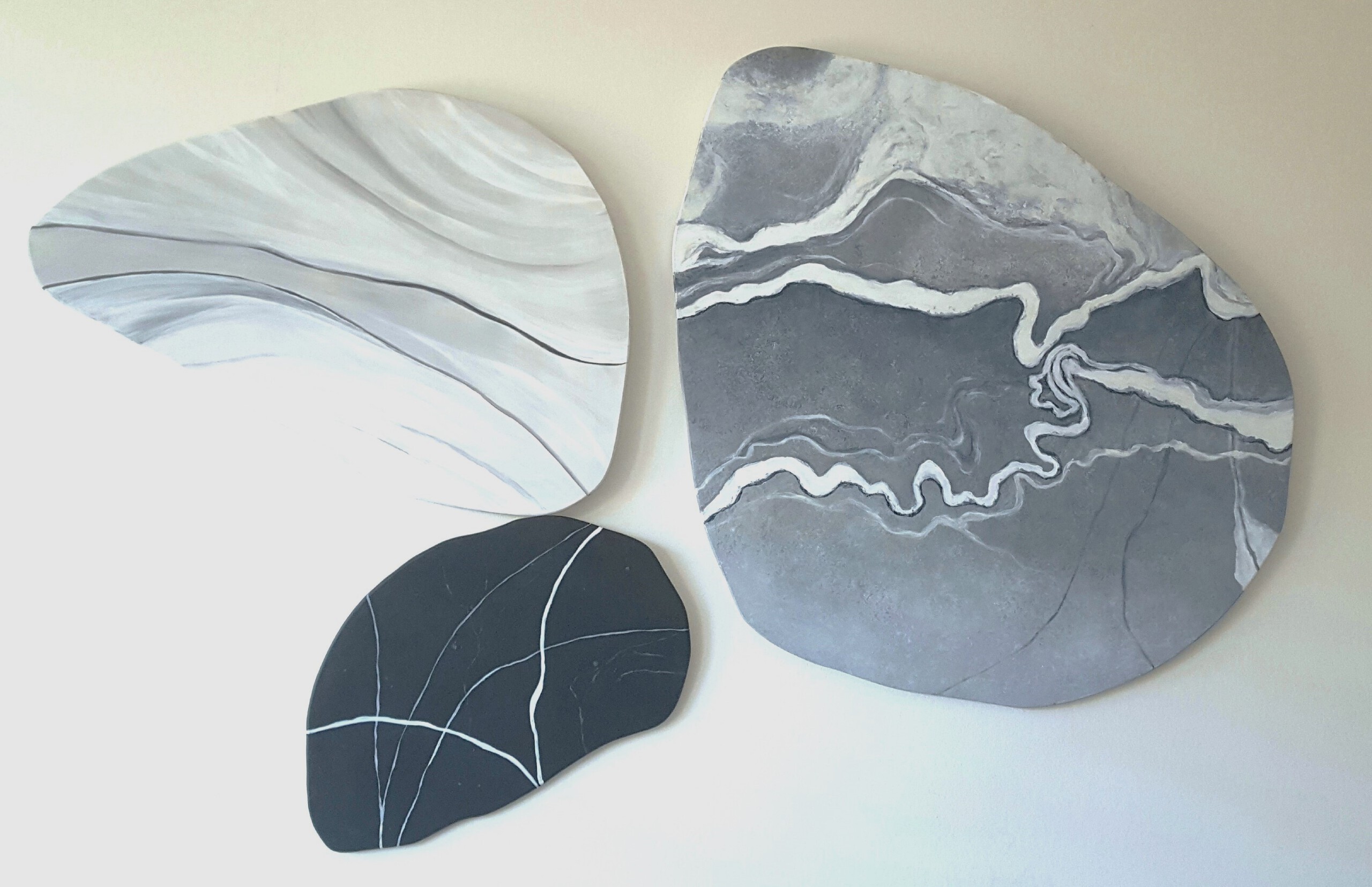 Drie keien gezaagd uit berkenmultiplex. Grootte: 90, 60 en 35 cm.
