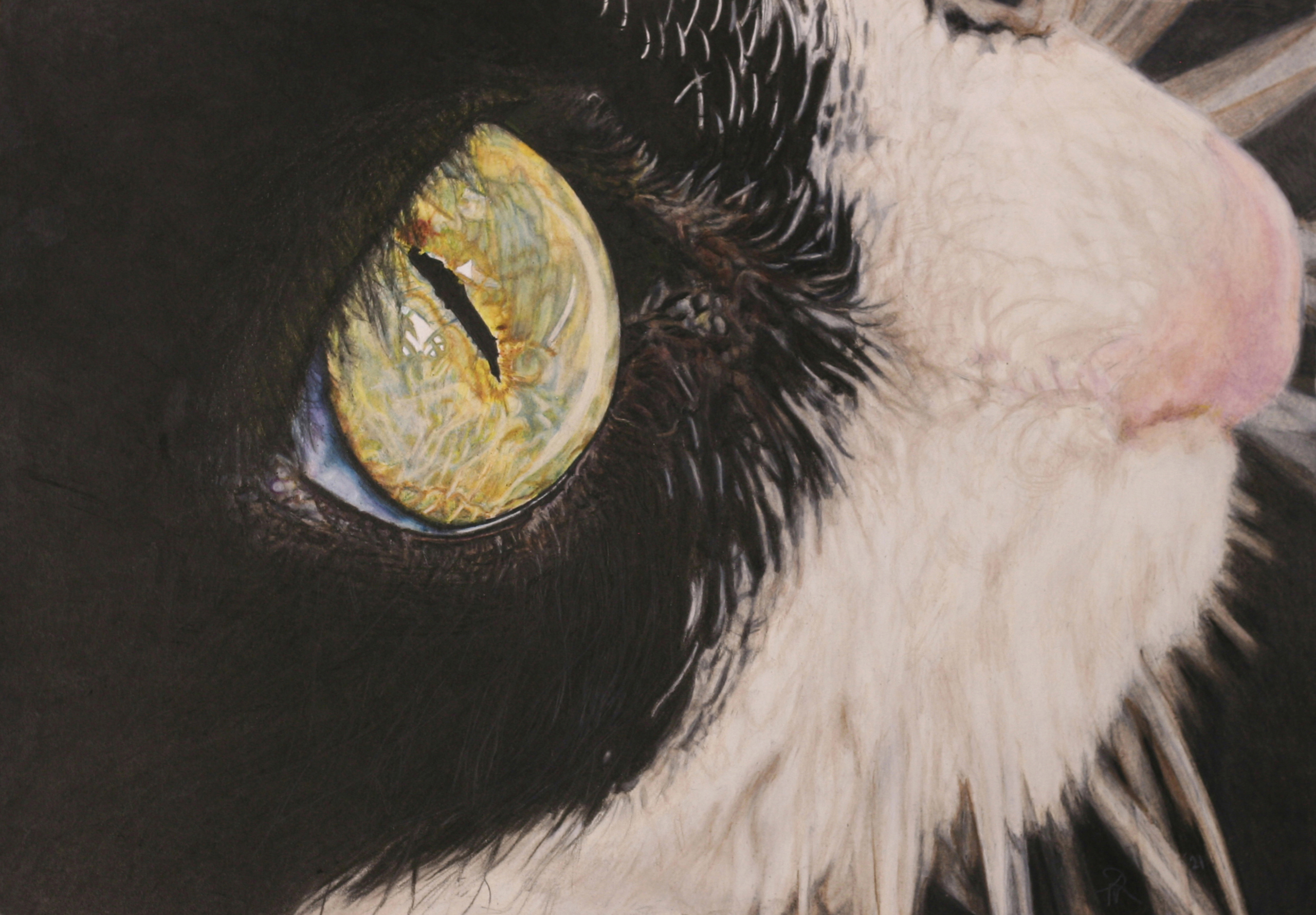 Fotorealistische tekening. Portret van een van mijn vroegere huisdieren. Het oog is een wereld op zich. Magisch. Hierbij heb ik Lightfast oliepotloden en olie op papier gebruikt.
