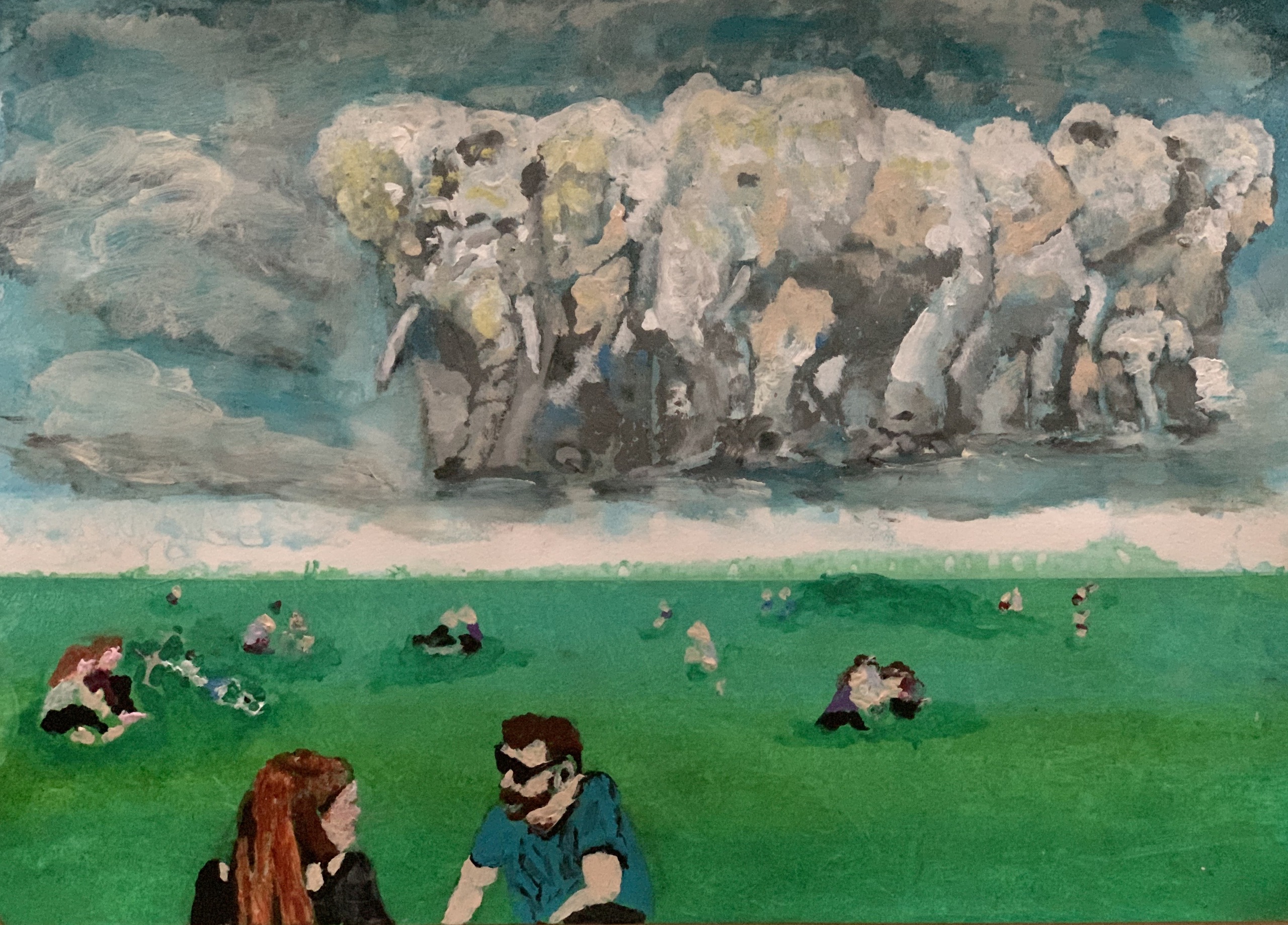 Wolken In De Vorm Van Olifanten Boven Grasveld Met Mensen Die Zitten Het Gras