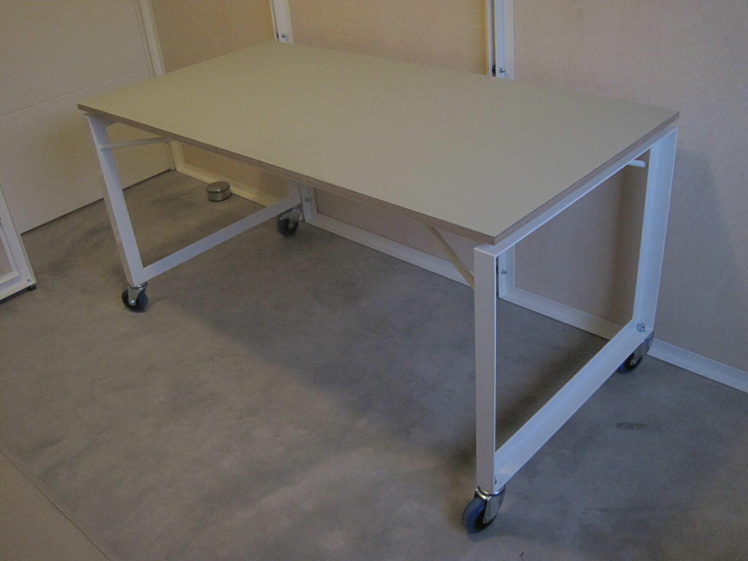 Deze werktafel op wielen is onderdeel van de thuiswerkplek die ik heb mogen ontwerpen en maken. Met de 'vormgeving' met wit gecoat 'open' hoeklijn. Het tafelblad is voorzien van Desktop Marmoleum in de kleur lichtgroen. Op wieltjes is de tafel flexibel te plaatsen in de werkruimte.