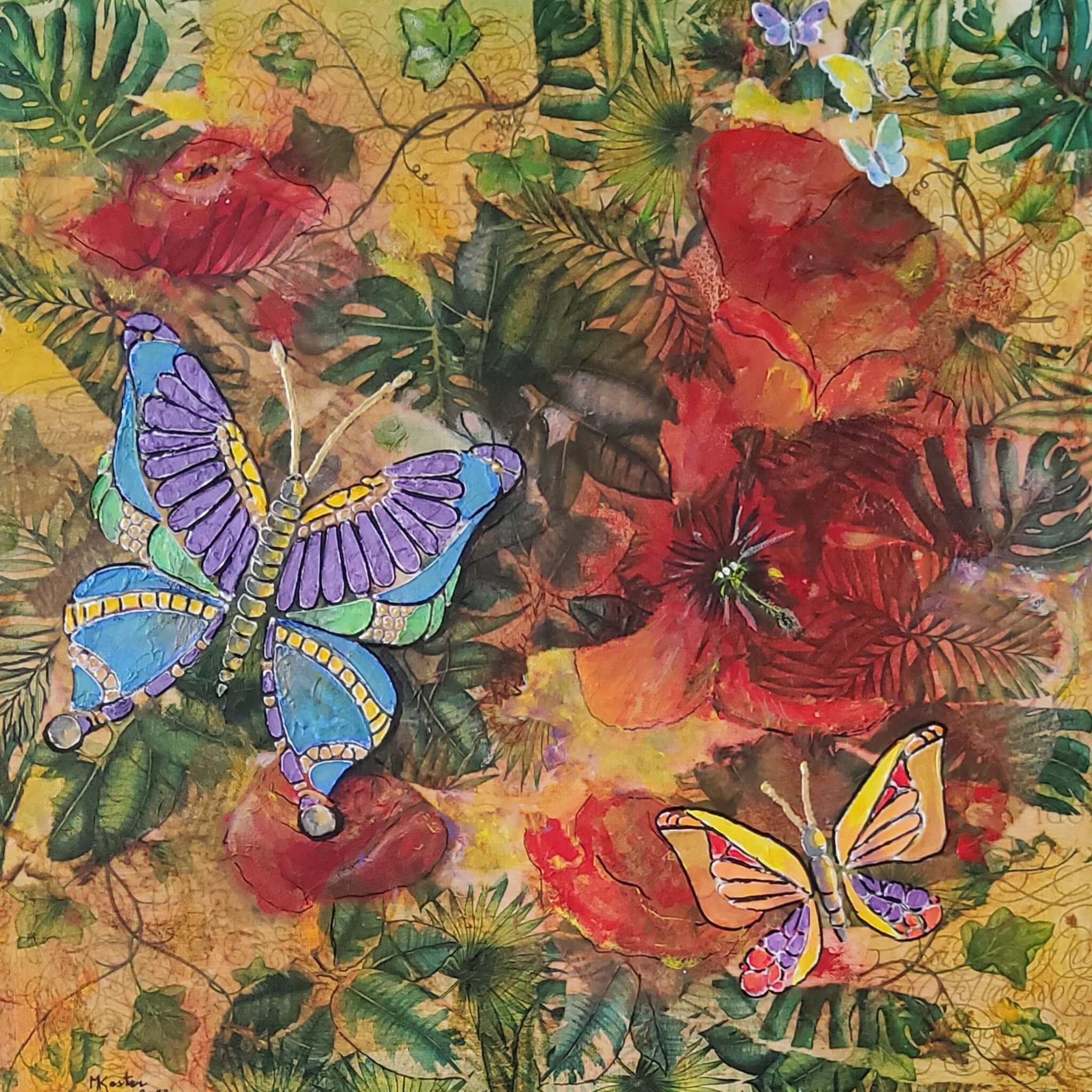 Vanuit gescheurd papier, stukken servet, inkten, verf, sjablonen en structuurpasta ontstaan werk. Gevernist en in houten galerielijst. Paneel
