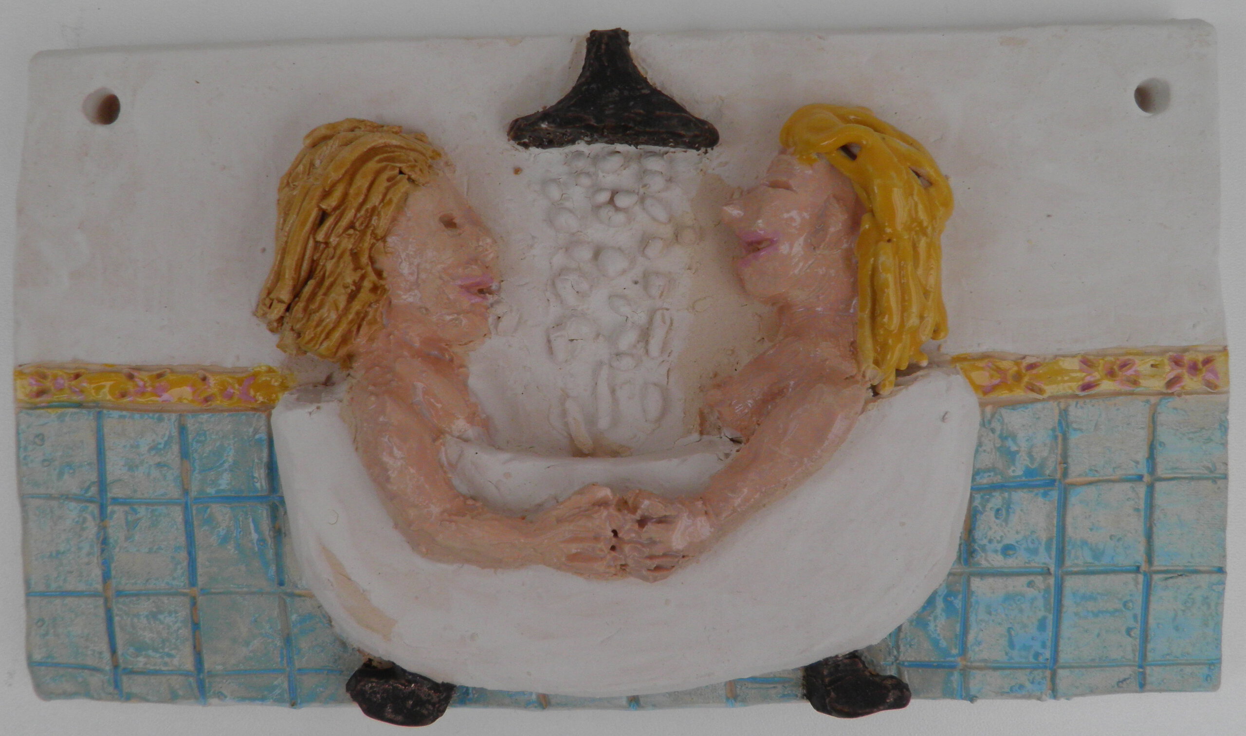 Tegeltje voor de badkamer. met reliëf. Humor.