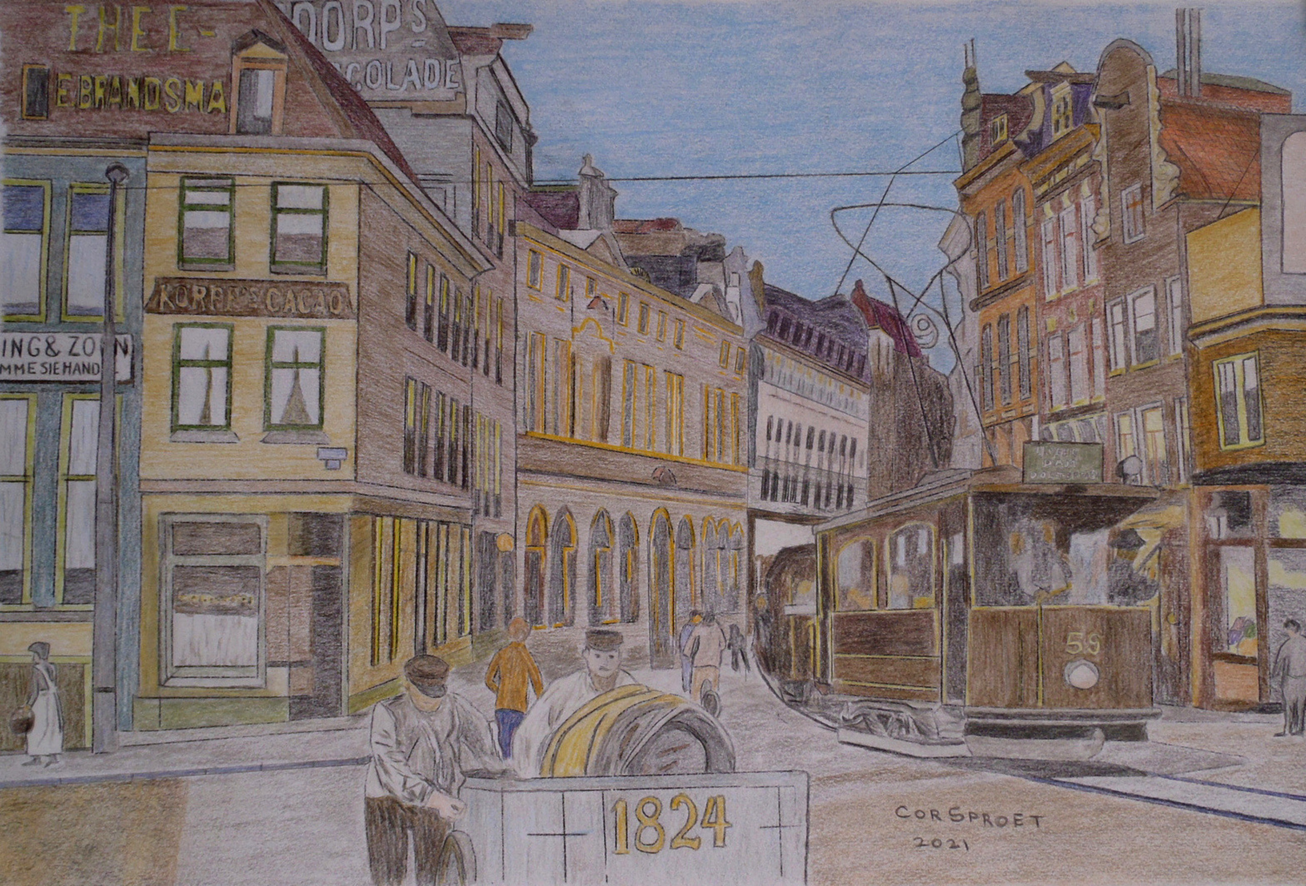 Een van de eerste electrische tramlijnen in Amsterdam was lijn 9 van het Centraal Station naar de Middenweg. Als media gebruikte ik kleurpotloden en op 100 grams Strathmore teken papier. Tegen de muren van de huizen reclame slogans van bekende chocolade merken.