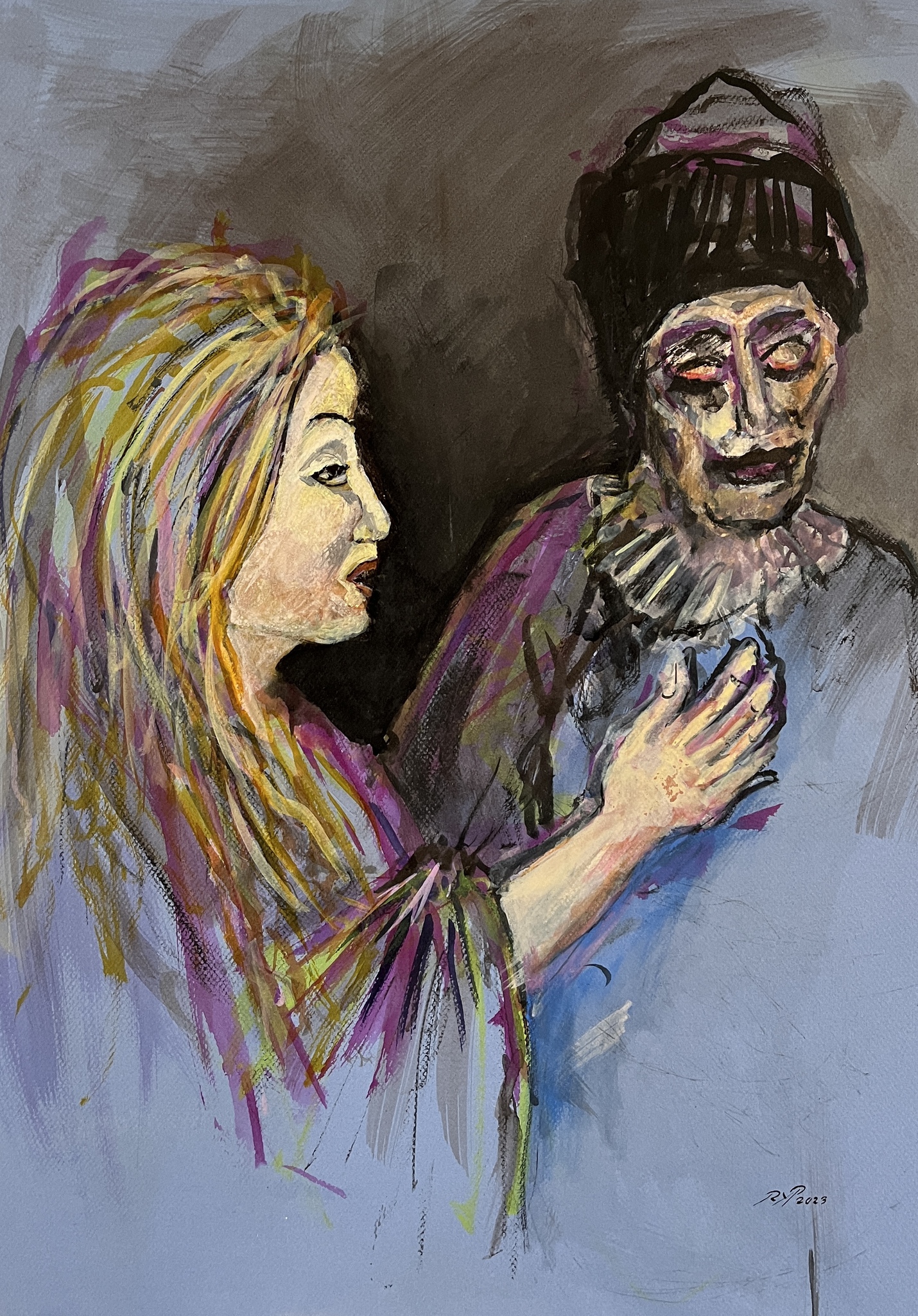 Zangeres en " Pierrot" . Op live - oefensessie gebaseerde fantasie. acrylinkt op blauw pastelpapier.