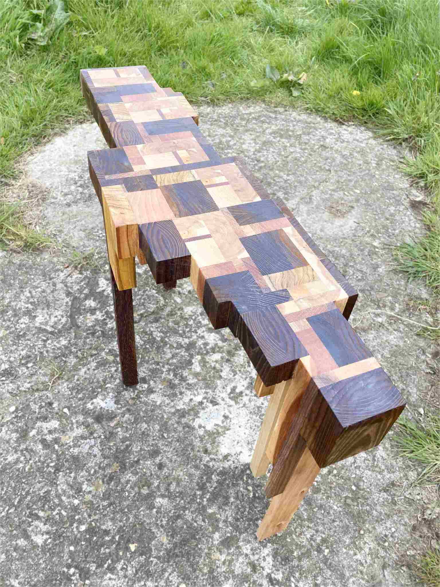 Een tafel die aan de wandel lijkt te zijn. De poten van verschillend formaat dragen een rijk geschakeerd blad waarbij het oog valt op het licht/donker contrast van het hout. Houtsoorten: eiken | meidoorn| mahonie| gekookt essen | amandel | azobé| olij Afgewerkt met hardwax