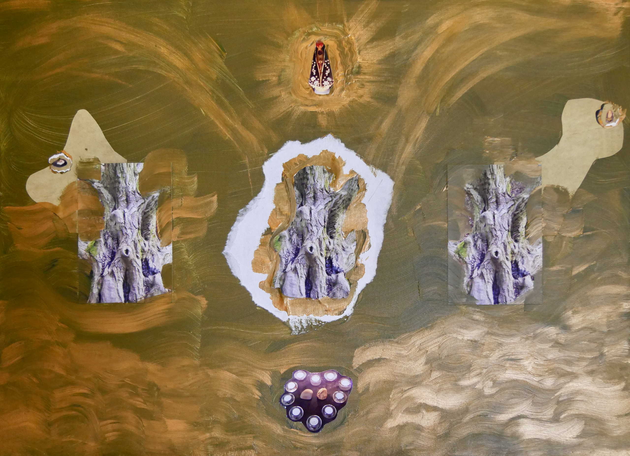In dit werk beeld ik de Oermoeder uit in verschillende vormen: de donkere Madonna uit Peru in een gouden licht aan de bovenzijde. Onder haar drie afbeeldingen van een oude omgevallen Beukhaag uit het Kralingse Bos. Deze groeit gewoon door terwijl die half verzakt is en vogels, vlinders, kinderen, volwassenen en honden spelen op de stam en genieten van de krachtige en zachte energie van deze boom. De ultieme 'Oer' energie zoals die in het Bos te voelen is. De middelste boom is uitgeknipt in de vrouwelijke vorm en vastgemaakt op geschept papier van plantenresten, waarin de planten nog te zien zijn. Aan de basis van het werk een hart van 10 waxinelichtjes met daarin twee stenen: een steen afkomstig uit Isla de la Luna (Titikaka meer) en een steen uit Sakkarah (Egypte). De donkere Madonna en het hart met stenen zijn gefotografeerd in een voormalige kerk in de buurt van Rotterdam, waar nu een serene stilte en rust heerst en tegelijkertijd een enorme Eigentijdse nieuwe Levensenergie. Dit werk is te zien als onderdeel van een Vierluik op de expositie MARIA, heilige Kracht en Oneindige goedheid in Art Centre Rotterdam tot en met 6 augustus.