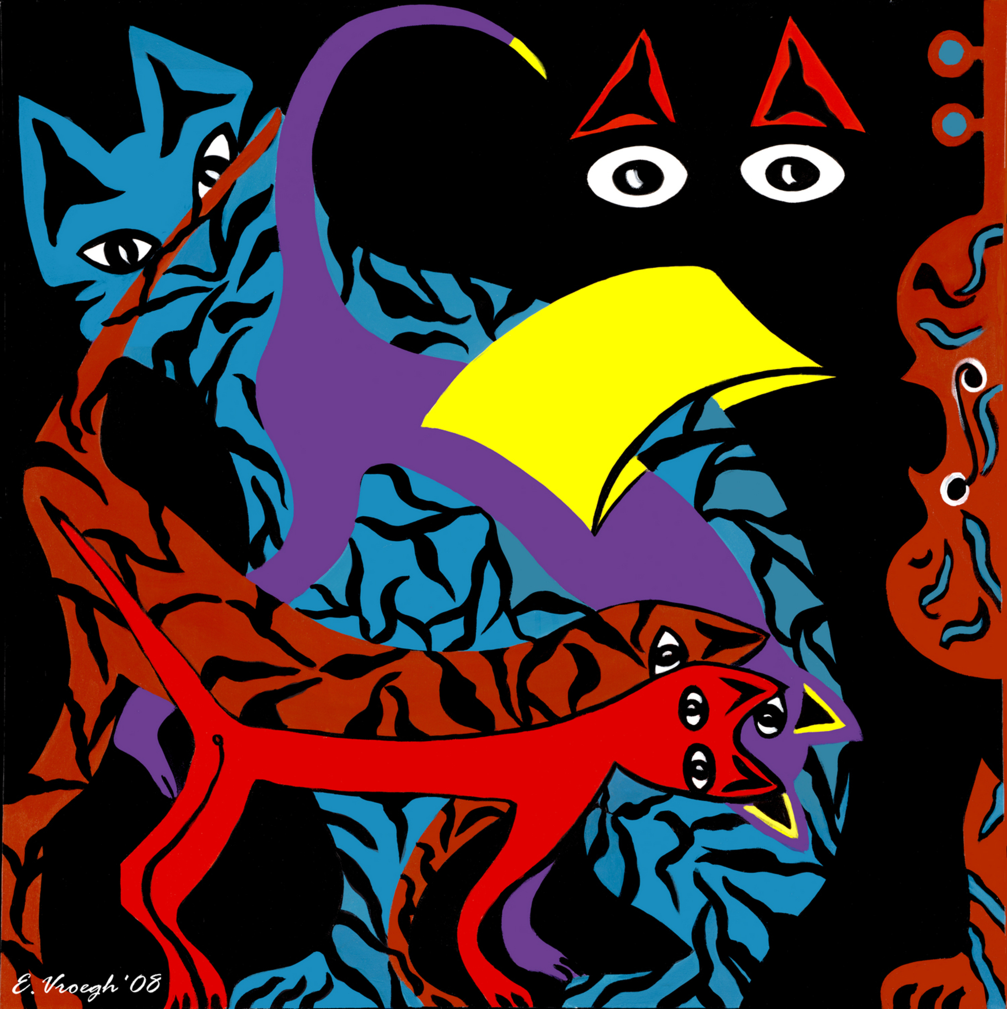 Galerie Artscreen moderne kunst van Ellen Vroegh. Kleurrijke schilderijen, fresco's met grotkunst, prints, giclees en objecten in diverse stijlen met wisselend palet.