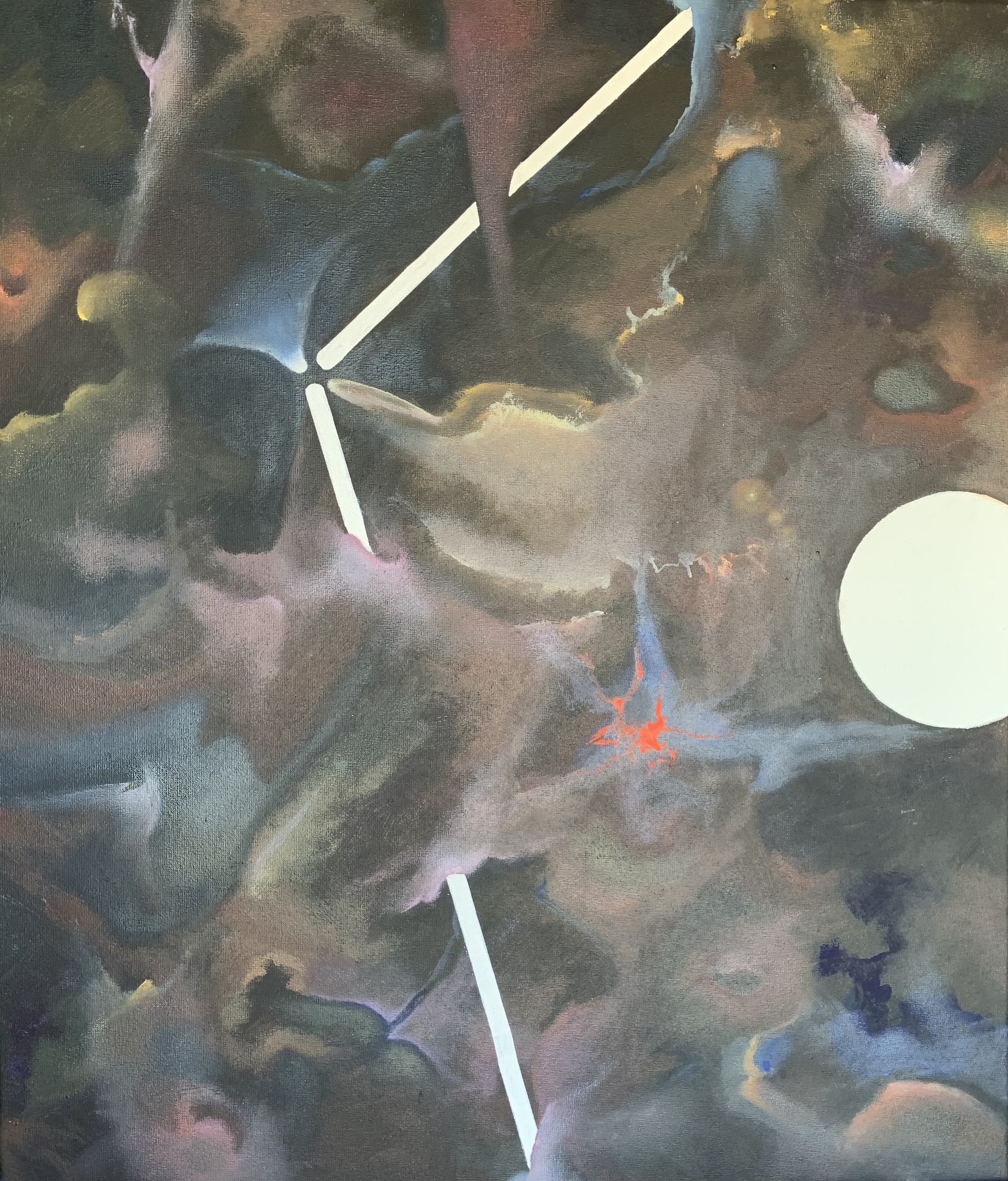 Uit de serie 'Universe' Op dit schilderij laat ik verbinding in de ruimte zien. Hemellichamen kunnen namelijk met elkaar communiceren.