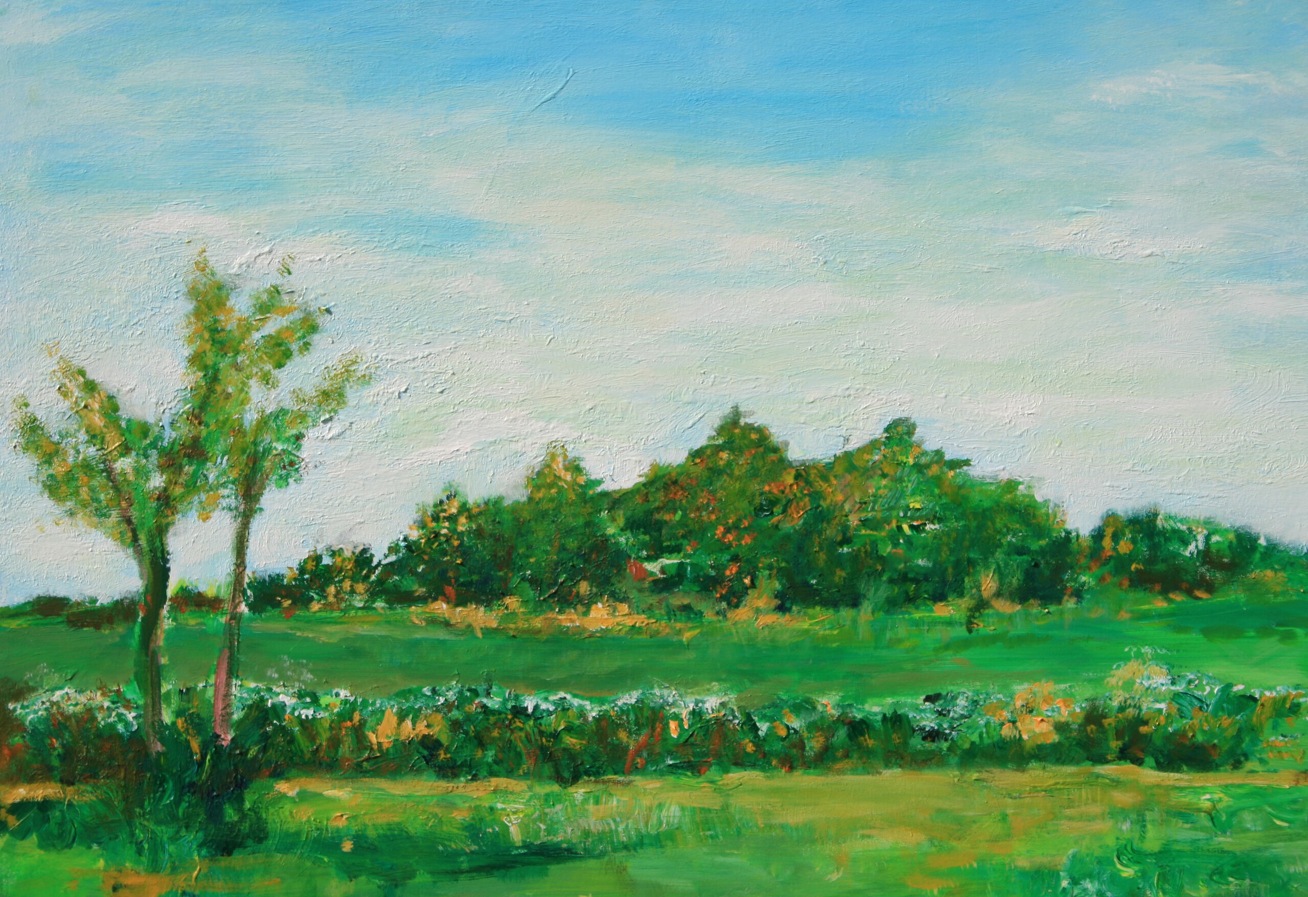Plaine aire werk tijdens de Colorfields Performance 2023 bij Elst in Gelderland, op 13 mei 2023, wanneer de zonkracht onverwacht heel sterk werd, net als in de zomer. het werk toont een deel van de omgeving waar het project gehouden wordt vanaf april tot oktober. Heel veel kleine details zijn weggelaten uit de omgeving. De organisator van het project is Dirk Hakze beeldend kunstenaar zie link www.thecolorfieldsperformanceproject