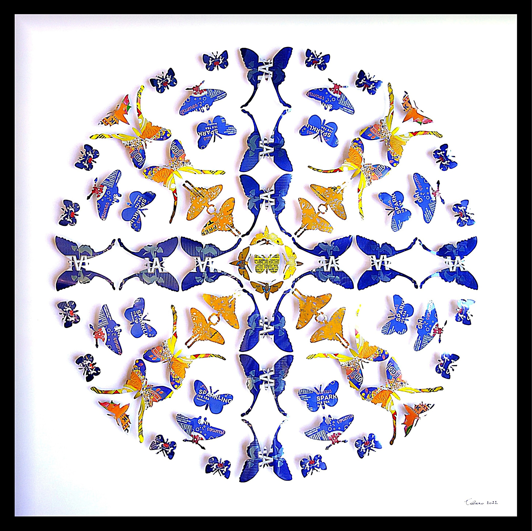 Metaal en aluminium van gerecycleerde drankblikjes op schuimkarton in zwarte, houten kader. De zwarte rand / kader is onderdeel van het werk.