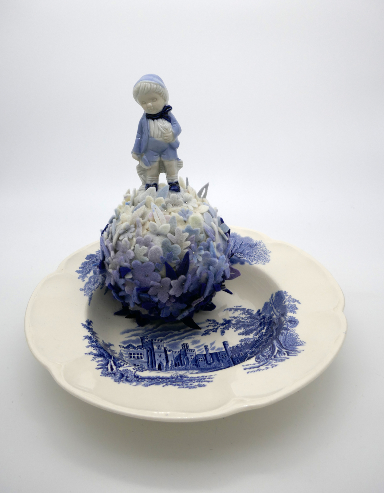 Objecten van deels handgeverfd vilt, kapot keramiek en of glas.