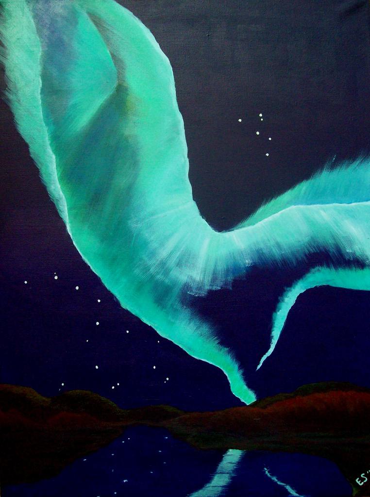 Opdracht thema was Beren. Door verder te kijken dan de eerste indruk ontstaat het idee om de sterrenbeelden grote en kleine beer te maken. Vandaaruit komt het idee van het Noorderlicht. Werkend op de achtergrond van de mythe over deze 2 beren ontstaat een mysterieus en surreel schilderij. De ondergrond is acryl op doek, het noorderlicht is geschilderd met H2Oil.