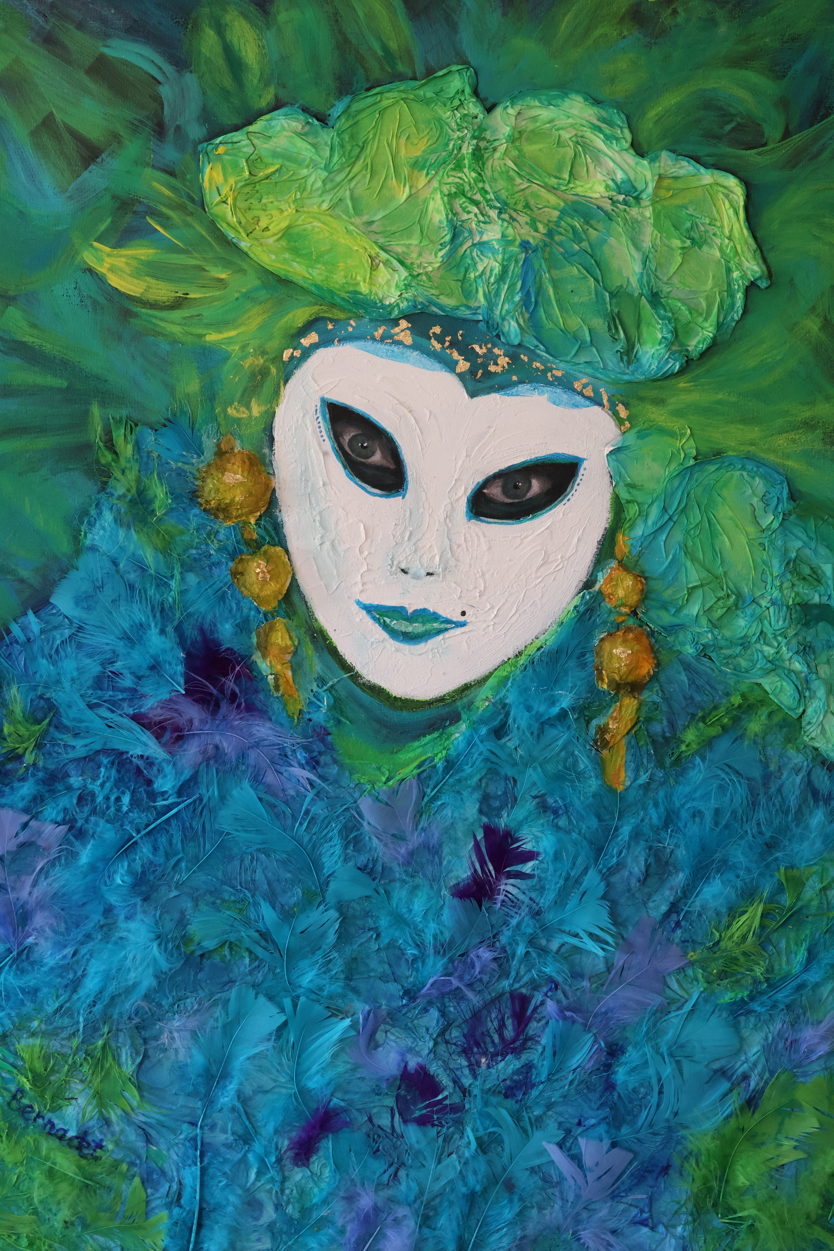 Acryl Groen Mixed Media Papier Kleurrijk Carnaval Ogen Doek Blauwe Veren Masker Groene Verf Fel Venetië Venetiaans
