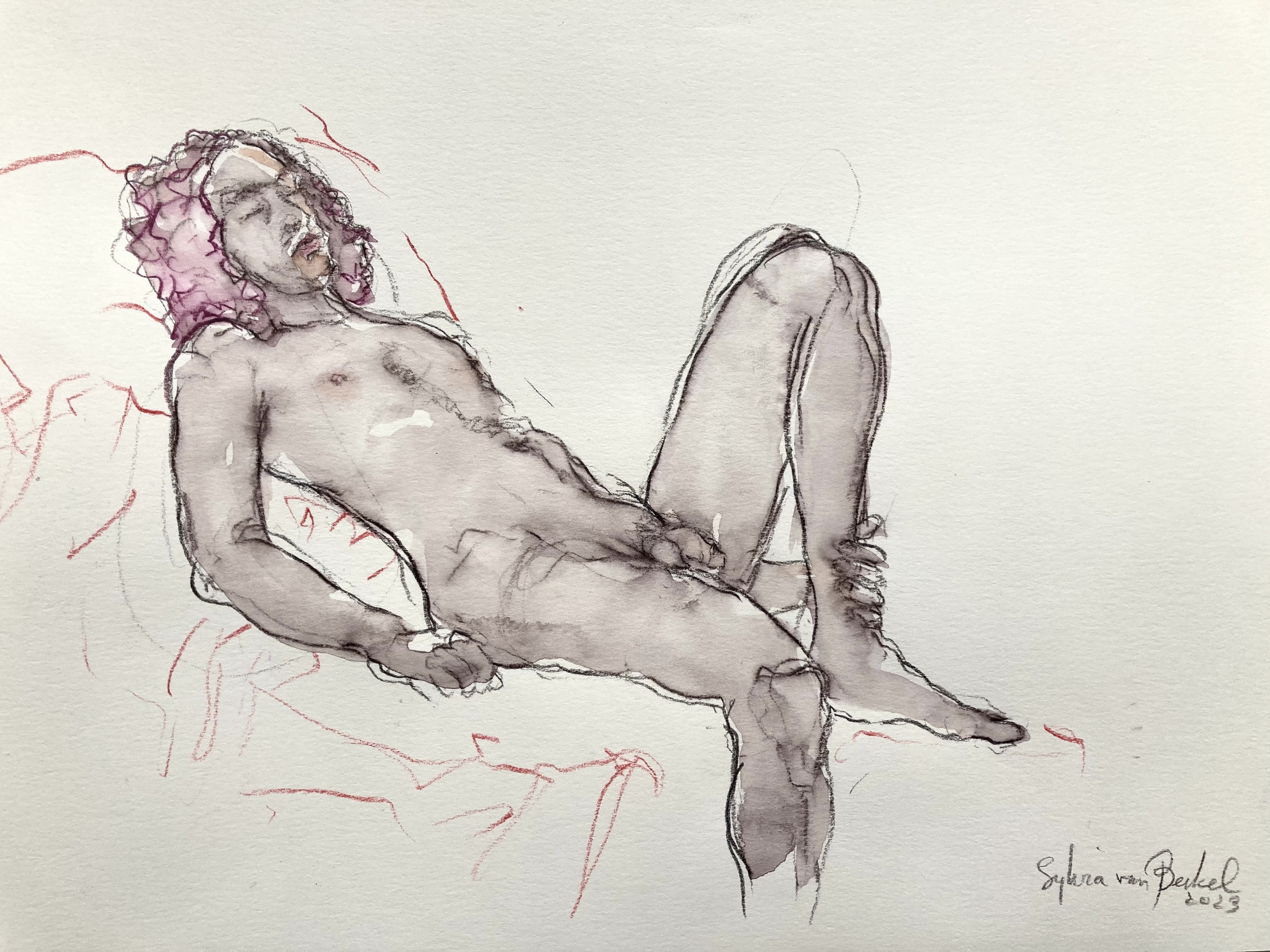 Naakte man half ziittend, half liggend