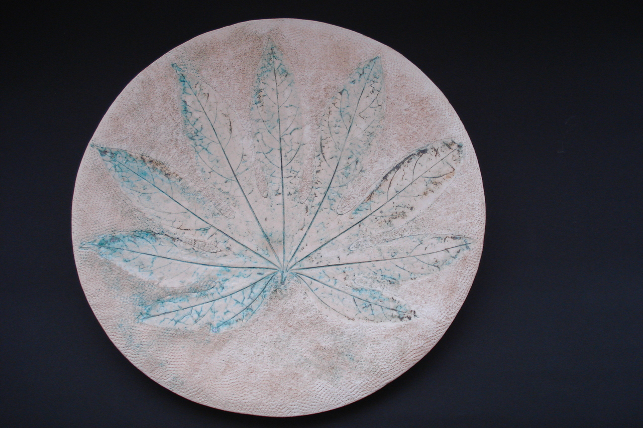 Fatsia Japonica afbeelding in roze bakkende klei, glazuur met tedere uitstraling