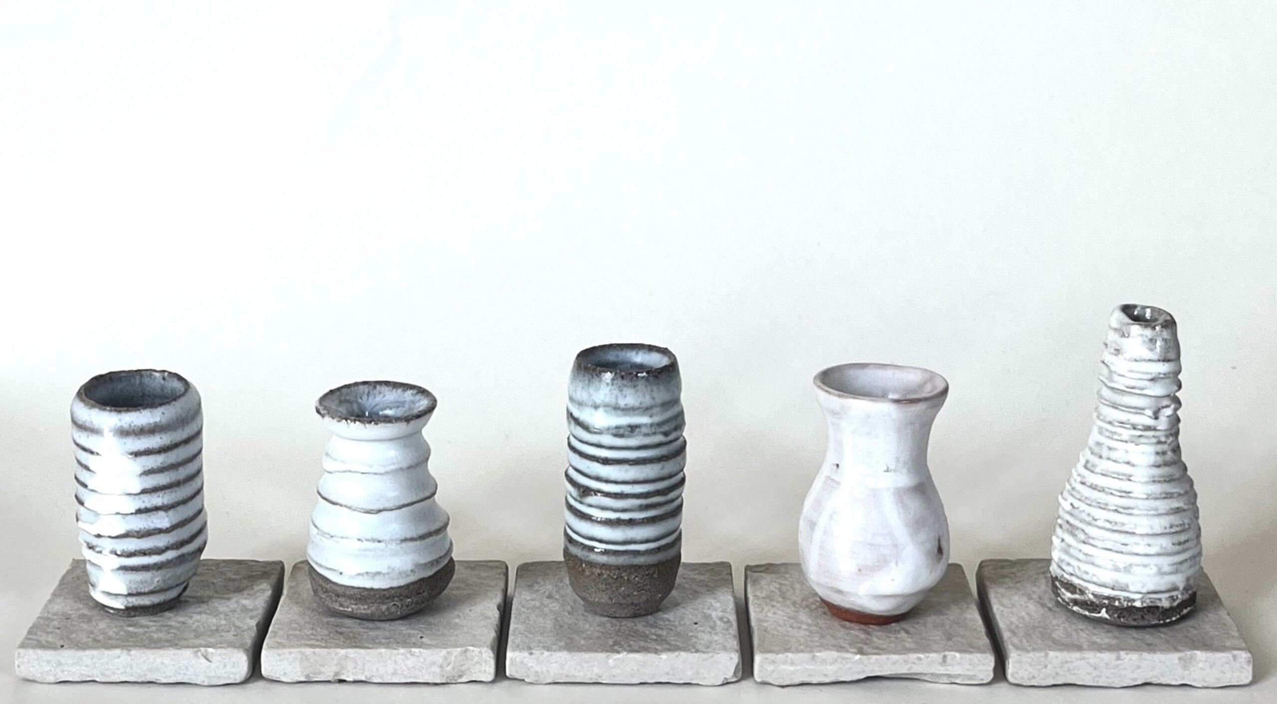 5 geringe vazen in een compositie van lijnenspel en tegeltjes