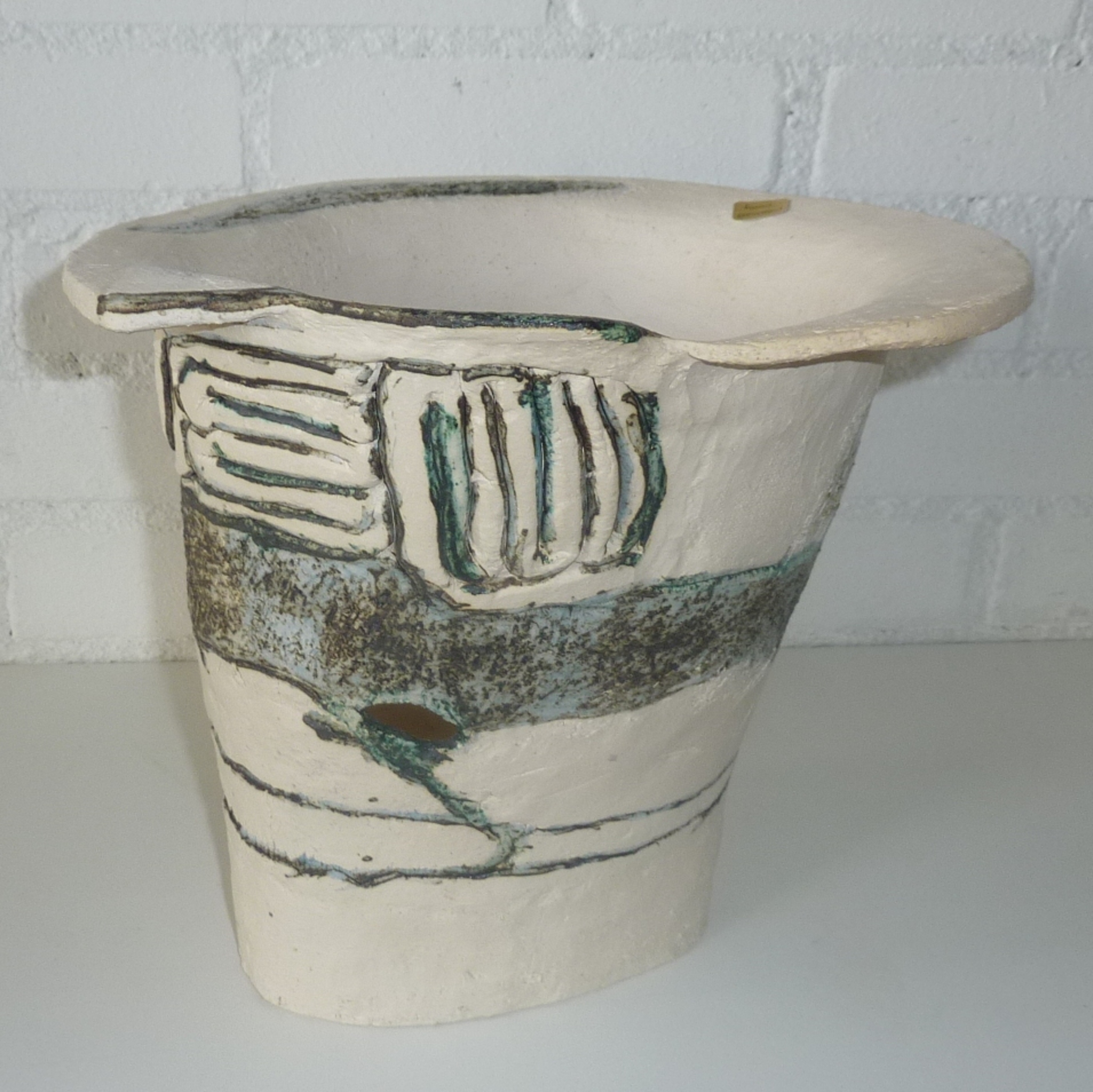 Gemaakt van grove chamotte klei en bewerkt met enkel kobaltoxide