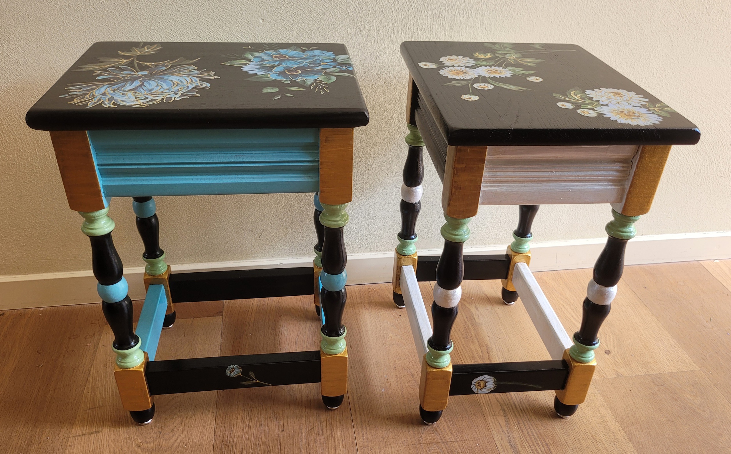 Twee kleine tafeltjes, in verschillende kleuren beschilderd, die elkaar complementeren.