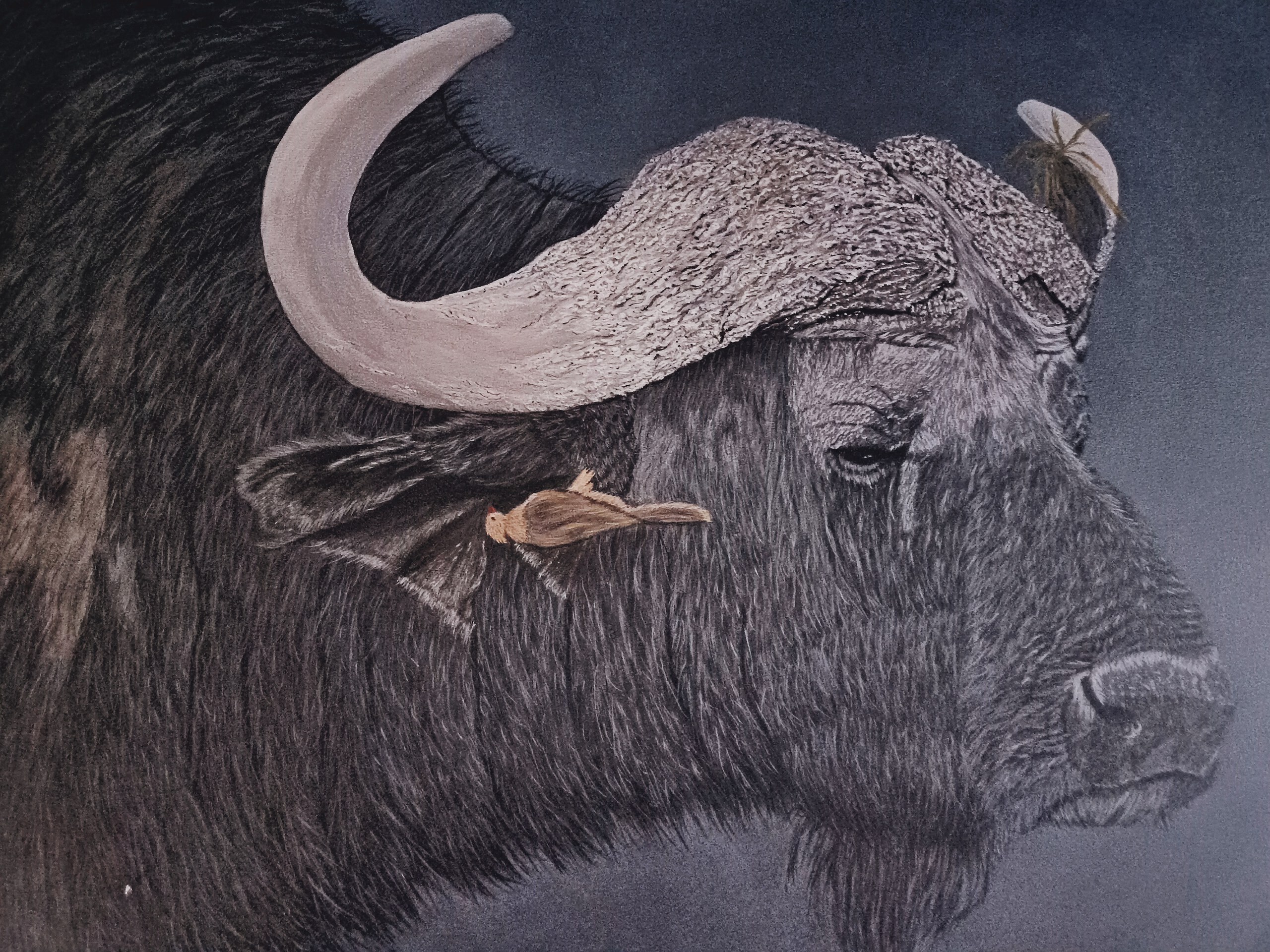Kafferbuffel met vogeltje Gloss vernis In grijze baklijst