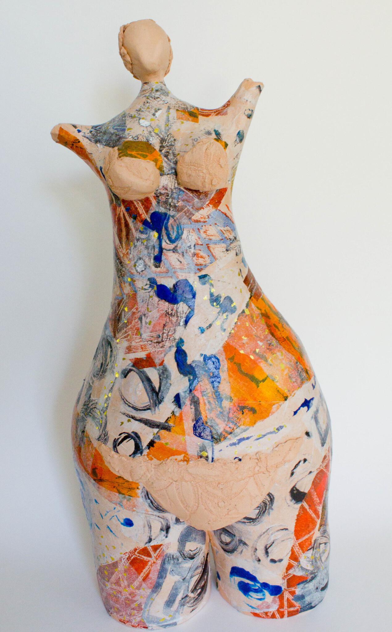 Keramiek torso. Bij dit damesfiguur wilde ik een combinatie van 2 technieken toepassen. Met een gelli-plate heb ik krabbels met acrylverf op vloeipapier overgebracht. Deze heb ik toen op het lichaam van deze zwemmer geplakt, met vloeibaar medium. Het hoofd en de "bikini" heb ik uitgespaard.