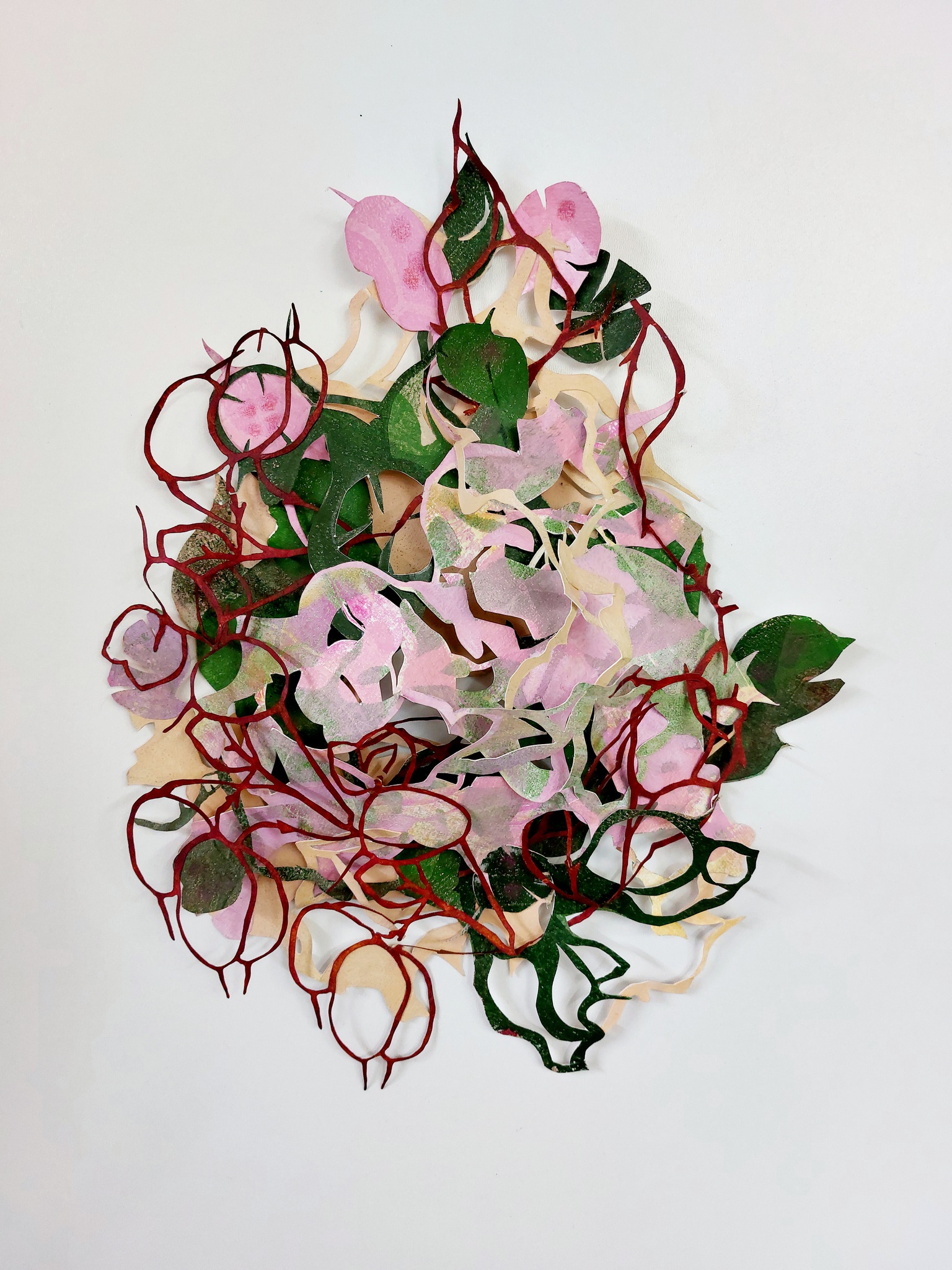 Natuurlijke vormen en patronen zijn het uitgangspunt voor ruimtelijke tekeningen en collages die zich los en speels over de muur verspreiden. Donkere stevige vormen, rond, ovaal, of als schaduwen, vaak gesneden uit karton, vormen een basis. Daarop en daaruit groeit bewerkt papier in allerlei vormen en structuren, heel organisch. Het papier is afwisselend fijn betekend of ruig bewerkt met krijt, inkt, verf, en met mes of schaar. In natuurlijke tinten, maar ook in zwart-wit, met soms juist een fel fluorescerend accent. Fijn als kant of filigraan, ruw als boomschors of een rotsblok. Het werk doet denken aan het lijnenspel van boomtakken, lianen, jonge loten van planten, levende organismen, cellen, of biologische en geologische structuren. Zoals in de natuur alles ontstaat, groeit en voortdur