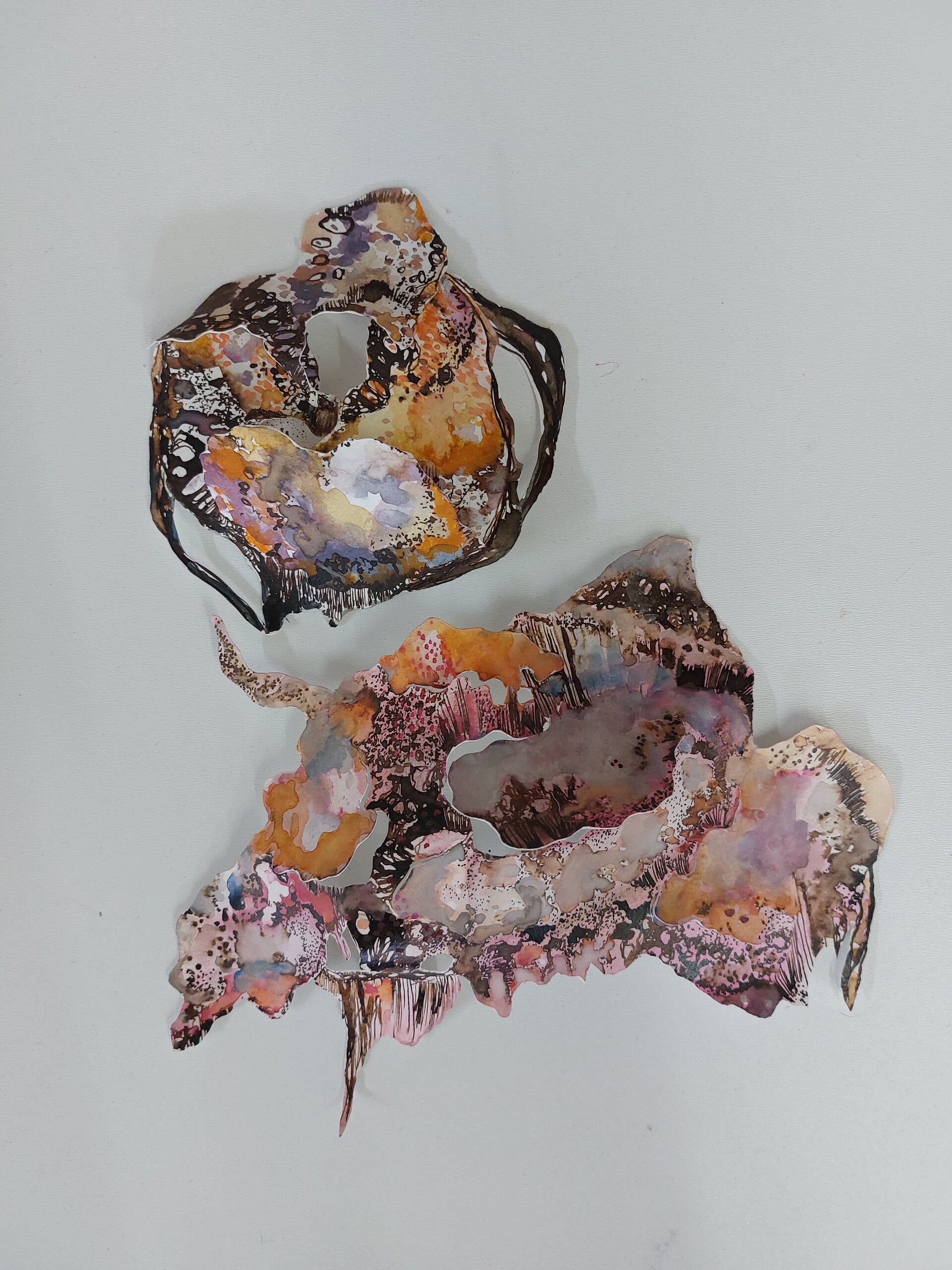 Ruimtelijke tekeningen en collages, geïnspireerd door alle organische vormen die de natuur rijk is, vormen nieuwe miniwerelden op zich.
