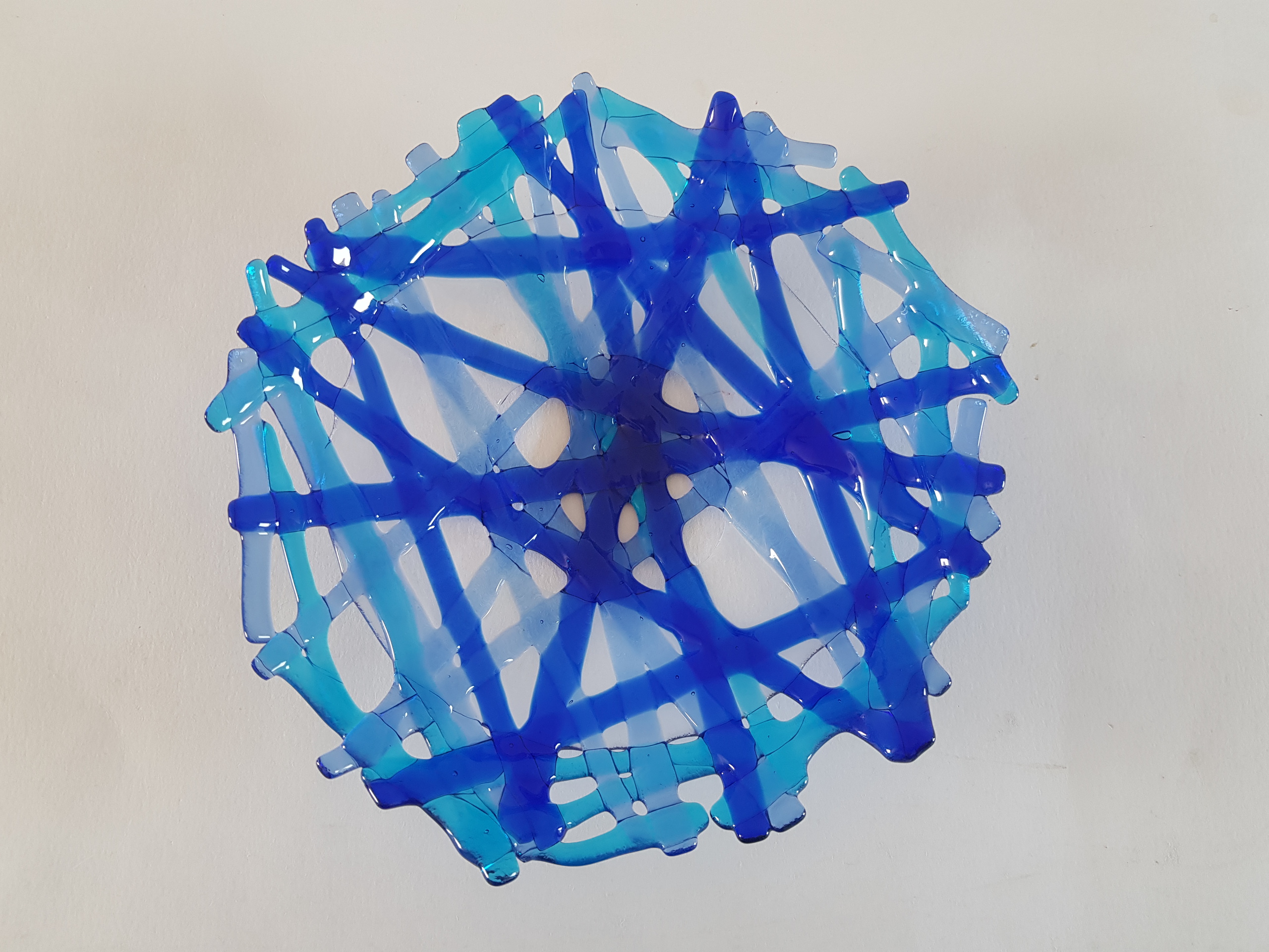 Glasschaal, opengewerkt en in blauwe tinten. 25 cm doorsnee en 5 cm hoog.