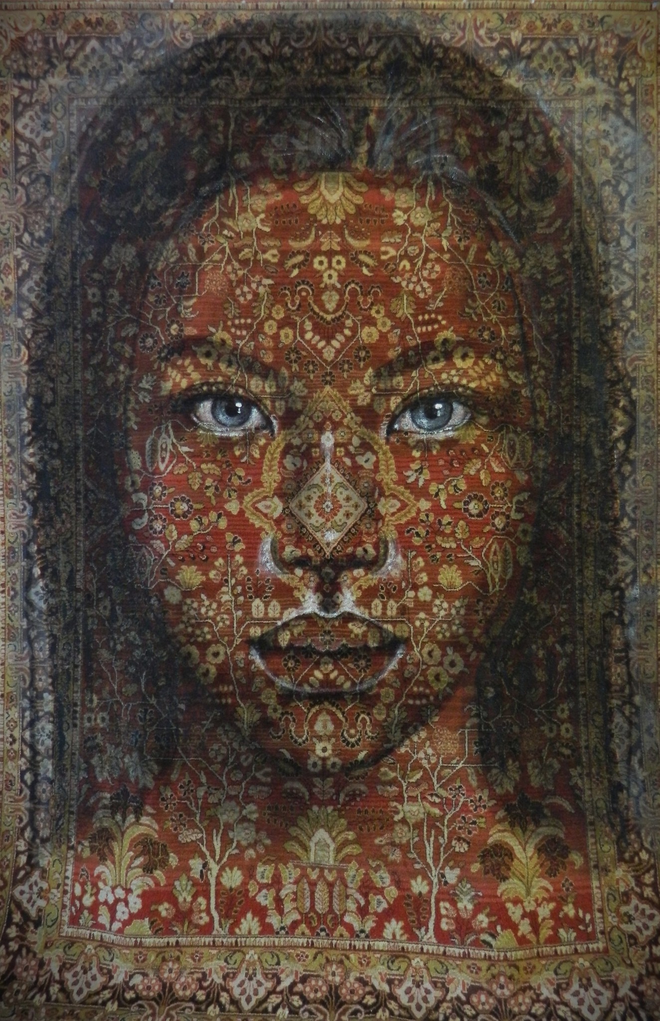 This is an unique piece of art, directly from the studio of the artist. A portrait of Itoshii(Japanese for sweet), painted on a vintage, woolen, hand knotted Persian carpet, with beautiful warm colors. The patterns of the rug emerge with her face, expressing the hope of different cultures to melt into one humanity. Definitely a conversation piece, and a statement in your room. With hanging mechanism. Jacqueline Klein Breteler is a Dutch artist with a studio in a little, rural village in Holland , where she lives with her husband and 5 sons. Surrounded by so much male virility, she keeps in touch with her femininity by making portraits of women. She paints in a loose style, sometimes colorful, sometimes sober, but always an eye-catcher. Her works have been exhibited in many places and art collectors all over the world are buying her work. Also included in Á year of art', an international art catalogue. Currently available at: Sille Gallery in Oudewater and Artfusion in Amsterdam.