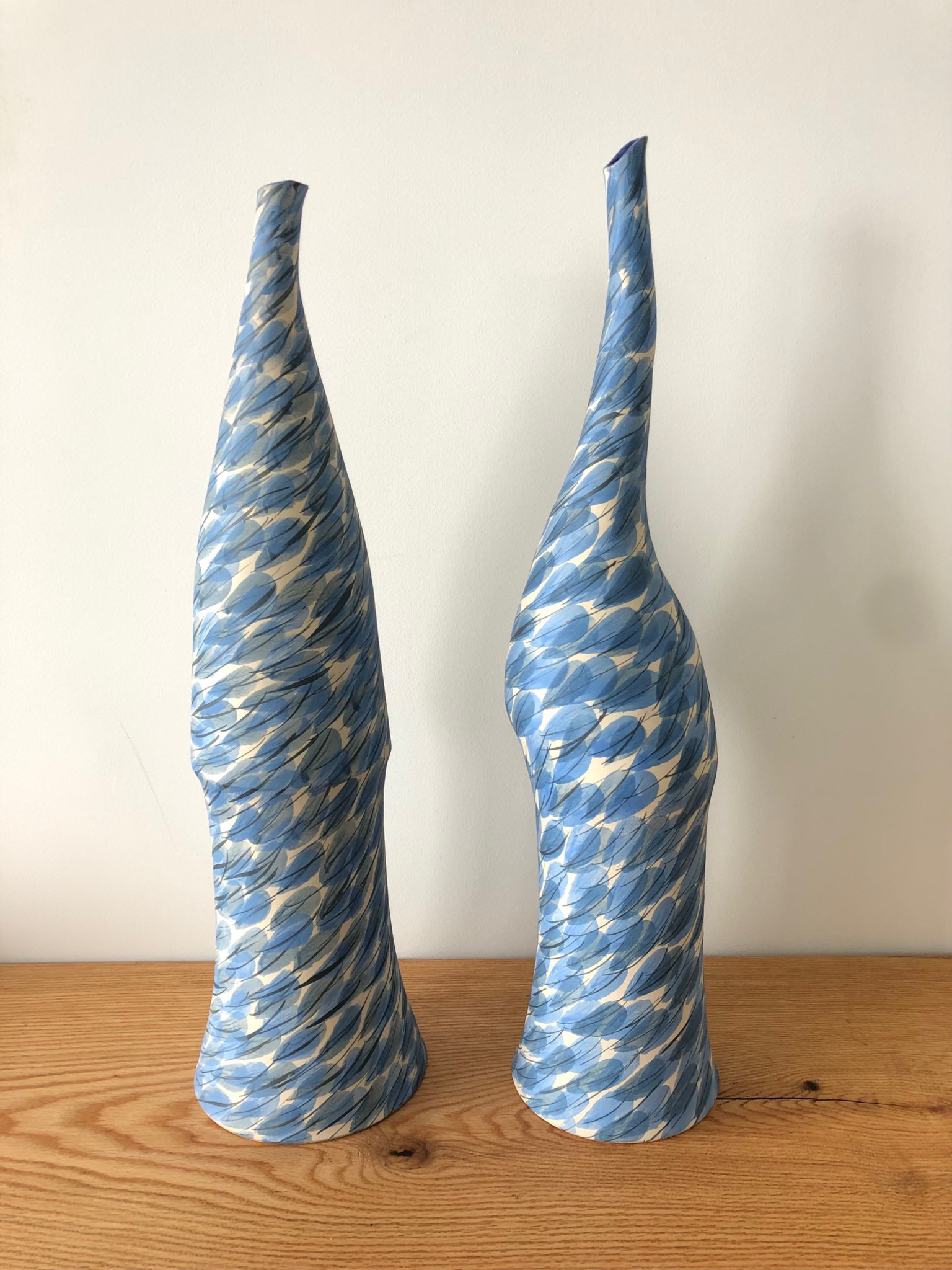 Gedraaid van steengoedklei met chamotte en zilverzand. Decoratie met slibs aan de buitenkant van een bladdecor in blauw en zwart. Bovenrand glazuur. Gestookt in gasoven op 1140 graden Celsius. Formaten: links: H. 57cm., Diam. 16 cm. rechts: H. 60 cm., Diam.13,5 cm. Zie ook onder Schalen: Kom! in hetzelfde decor.