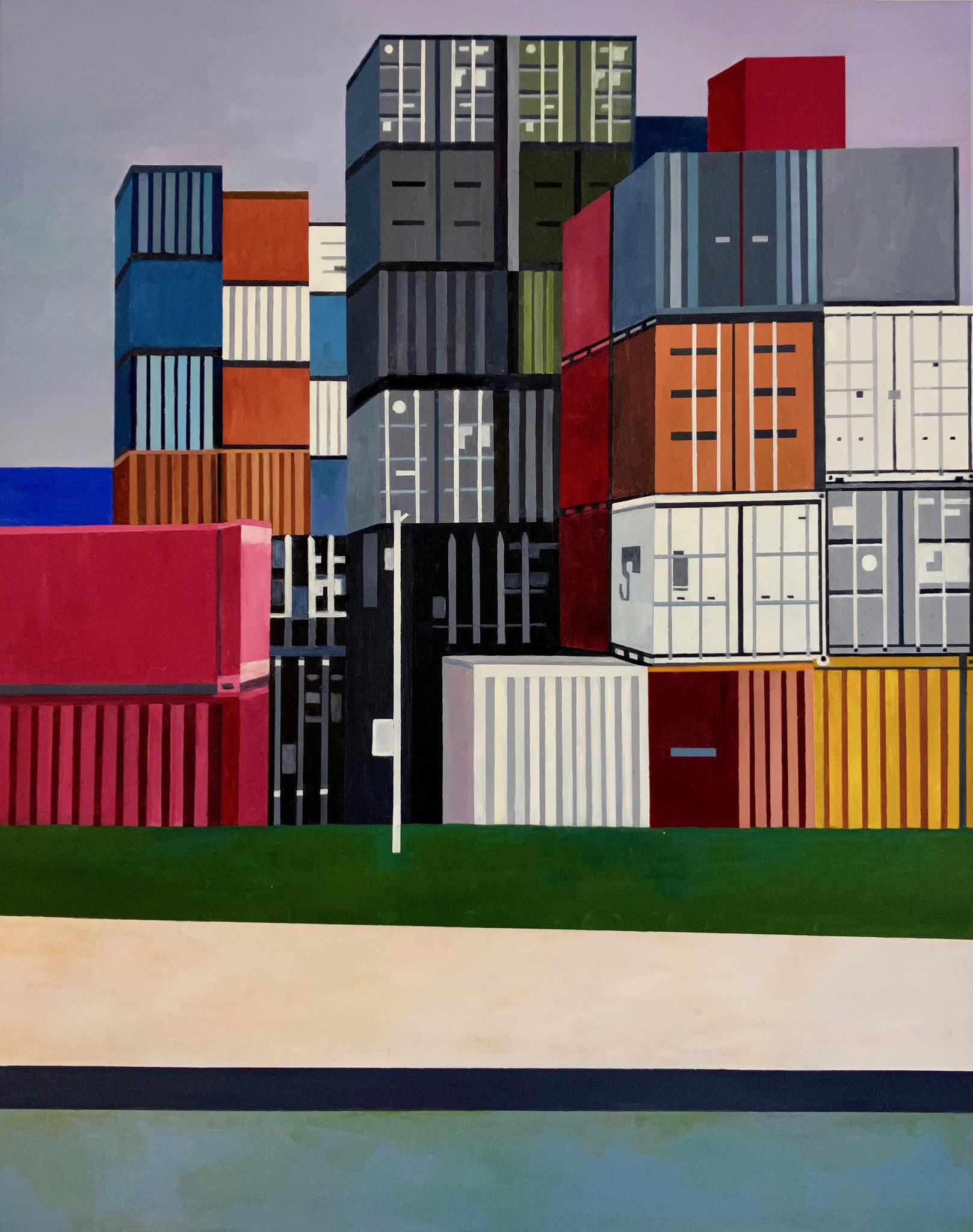 Rood Geel Blauw Groen Olieverf Doek Lucht Gras Rivier Veelkleurig Containers Kade