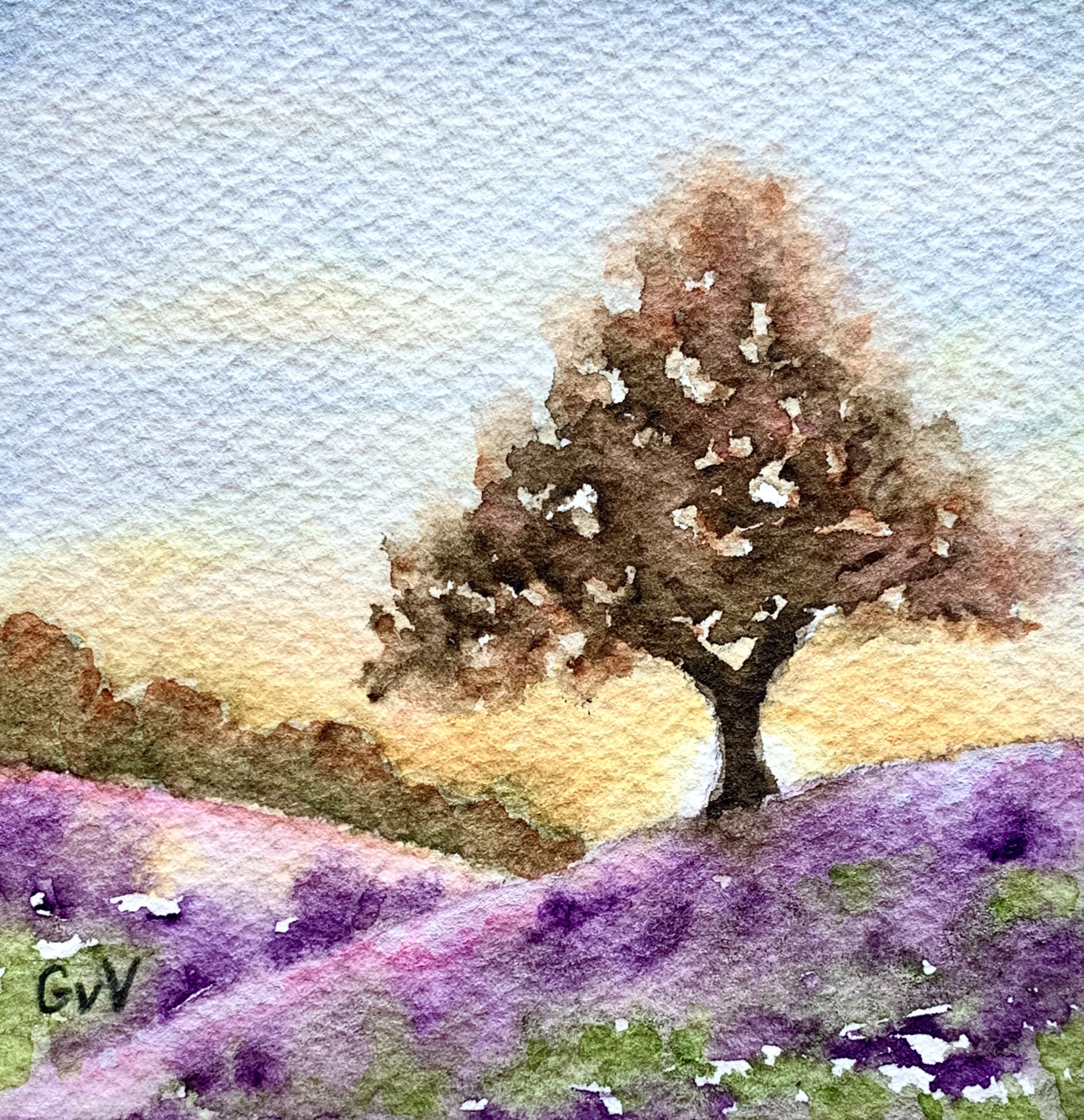 Postbank Landschap Zomer Heide Paars Aquarel Watercolor Realistisch Plenair Heuvels Miniatuurschilderij
