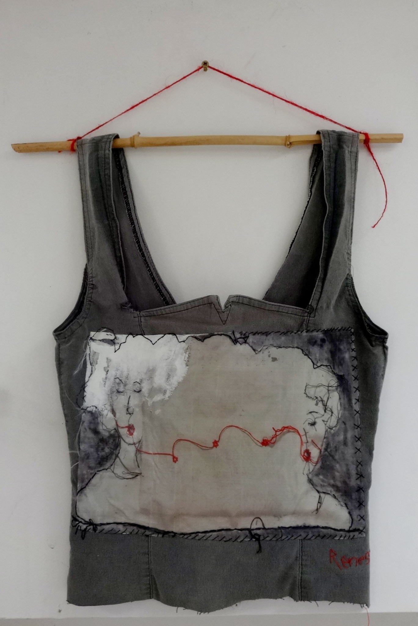 Transfer van foto van de achterkant van het werk "singing in the dark" op deel van dierbare jurk die ik heel lang geleden droeg. Daarna nog door mijn toenmalige puberdochters ook gedragen. De dames zelf zijn connected door de rode draad en de drager is connected met mijn verleden