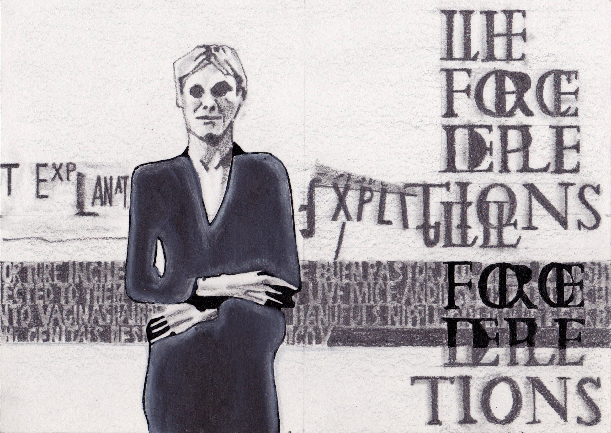 Portret van de Amerikaanse kunstenaar Nancy Spero (1926 - 2009) voor haar eigen text-based werk. Wat ik fascinerend vindt aan dit werk is dat het alleen uit tekst bestaat, de tekst zelf de betekenis in de weg zit en er tegelijkertijd een gevoel van dreiging en kracht vanuit gaat.