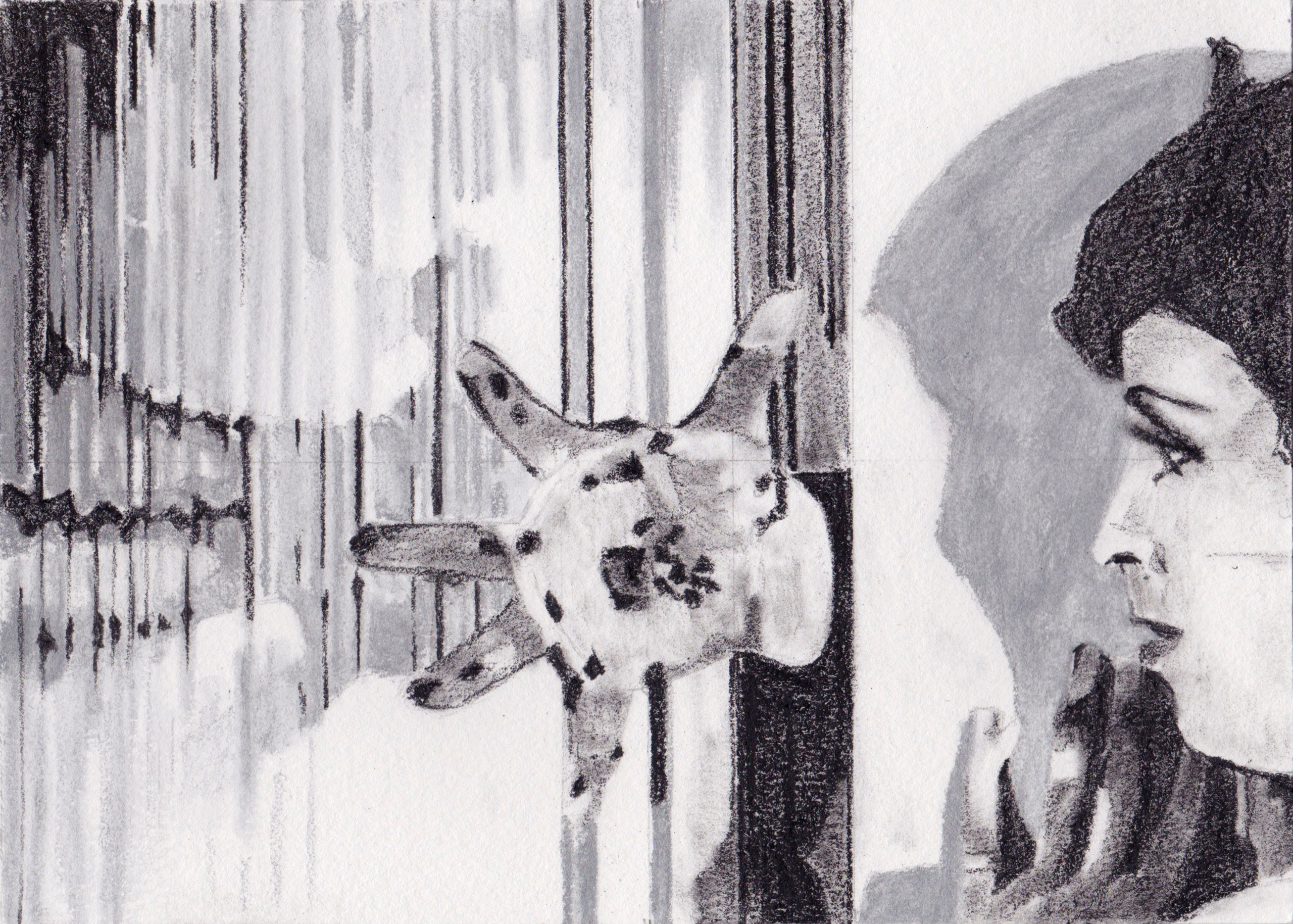 Portret gebaseerd op een filmstill van de film "Un chien Andalu" uit 1929 van Salvador Dali en Luis Bunuel. Naast de beroemde scene van een oogbol die doorsneden wordt is dit een scene waarin een vrouw zich realiseert dat haar hand vol mieren zit, een nachtmerrie die Luis Bunuel of Salvador Dali ooit had.