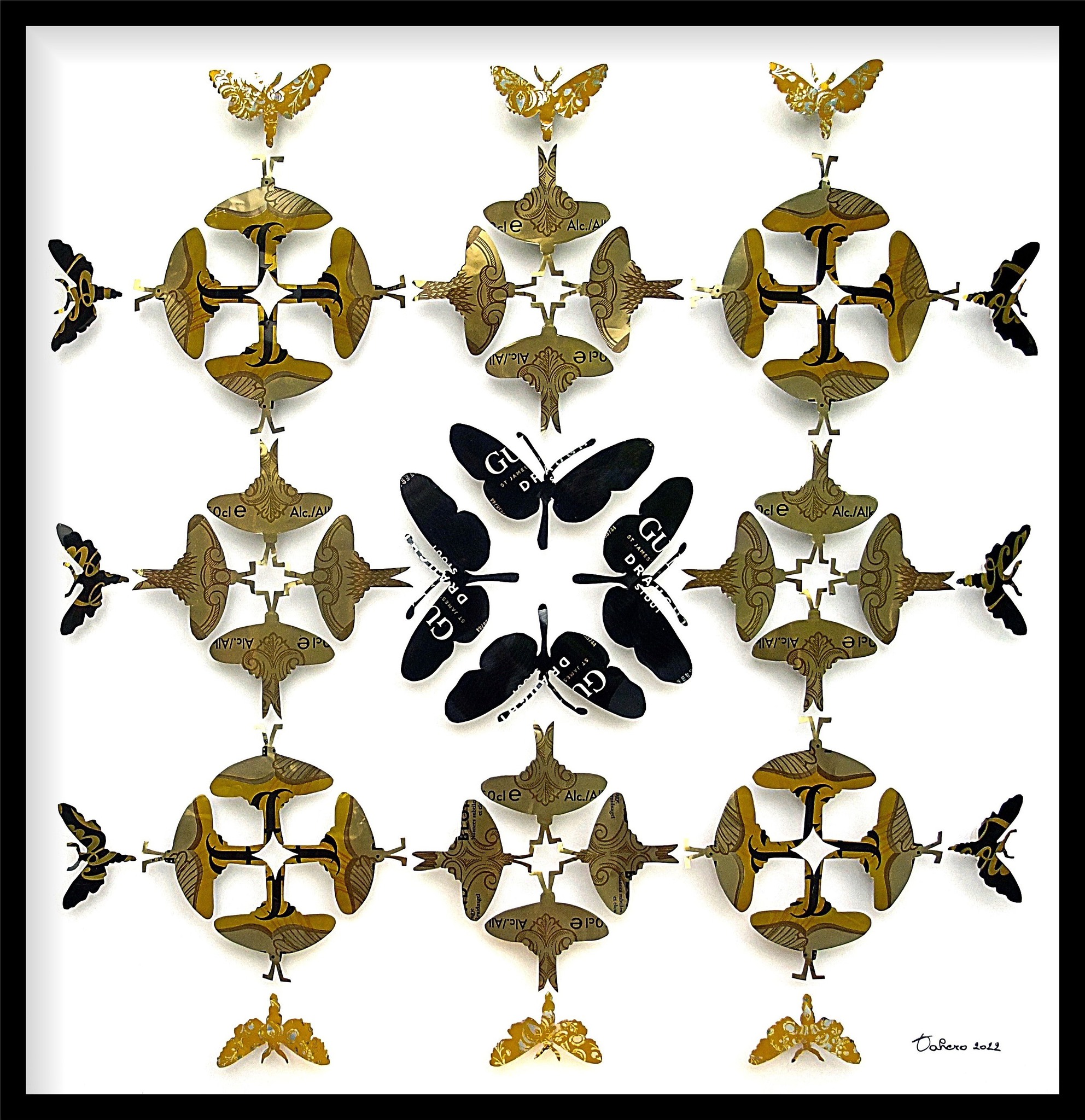 Metaal en aluminium van gerecycleerde drankblikjes op schuimkarton in zwarte, houten kader. De zwarte rand / kader is onderdeel van het werk.