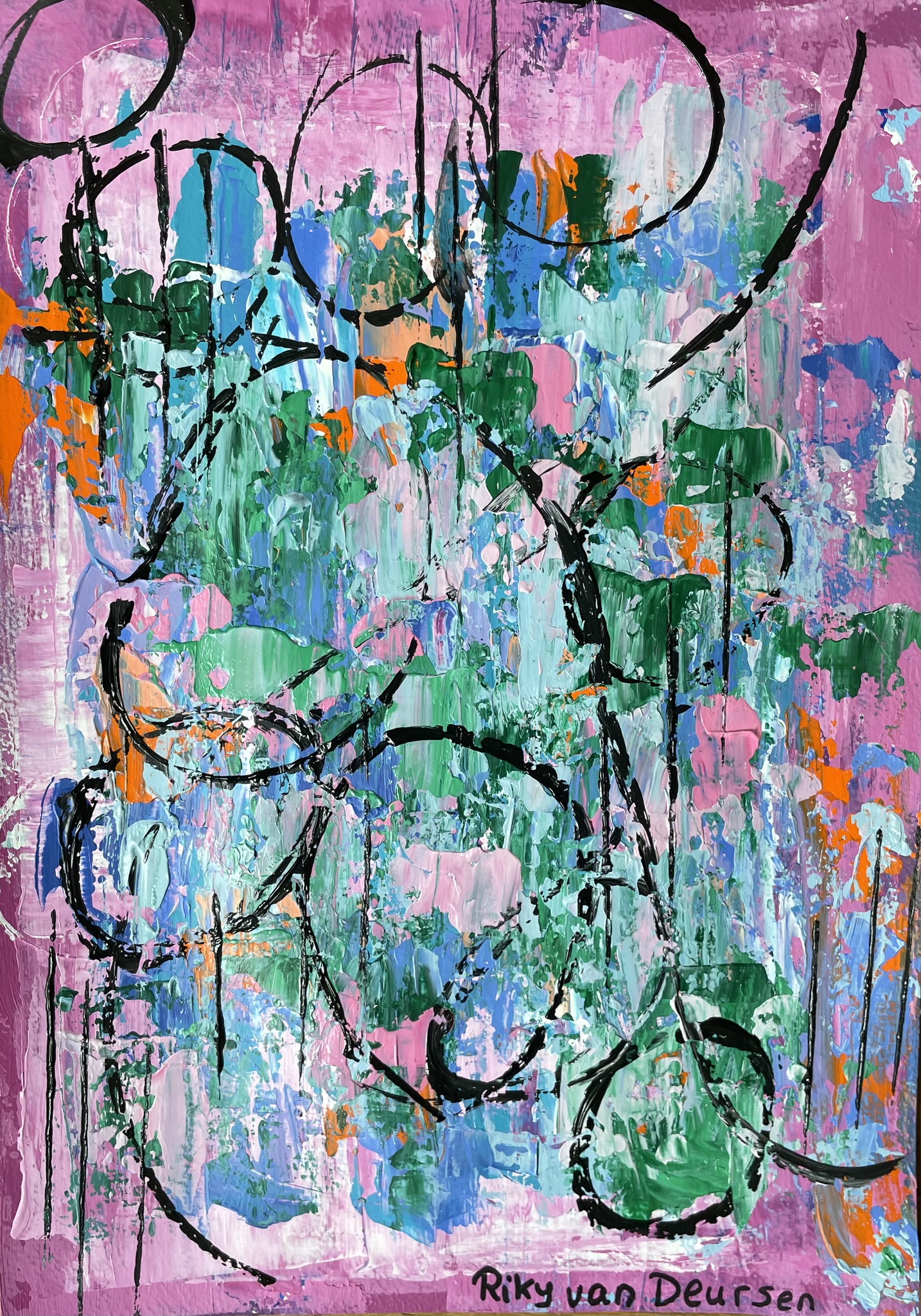 "Opportunities 2" is een abstract schilderij dat een wereld van eindeloze mogelijkheden onthult. Tegen een roze achtergrond dansen gedurfde streken blauw, oranje en groen over het doek, aangebracht met een paletmes en zorgvuldig gelaagd. De compositie komt tot leven door het samenspel van zwarte lijnen en organische vormen, wat resulteert in een boeiende stroming die de kijker aantrekt. Dit levendige kunstwerk vangt de essentie van exploratie en groei, en herinnert ons eraan het onverwachte te omarmen en nieuwe paden te ontdekken. Ook dit schilderij is ontstaan door over een "mislukt" schilderij heen te schilderen. Een aantal stukjes van het onderliggende werk zijn in het eindresultaat te zien. Samen met "Opportunities 1" vormt dit kunstwerk een mooi tweeluik.