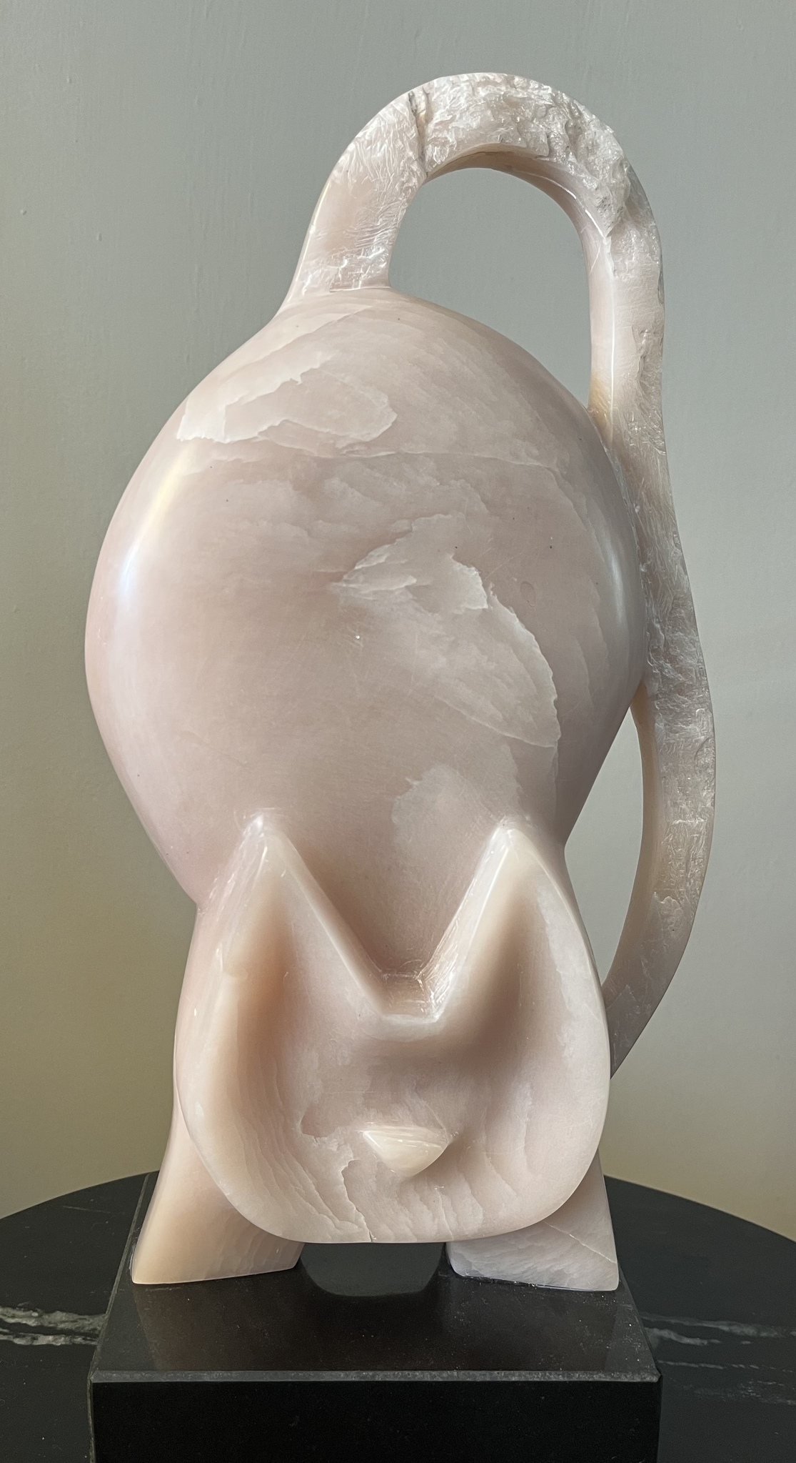 Staande roze poes van speksteen op een zwart granieten sokkel.