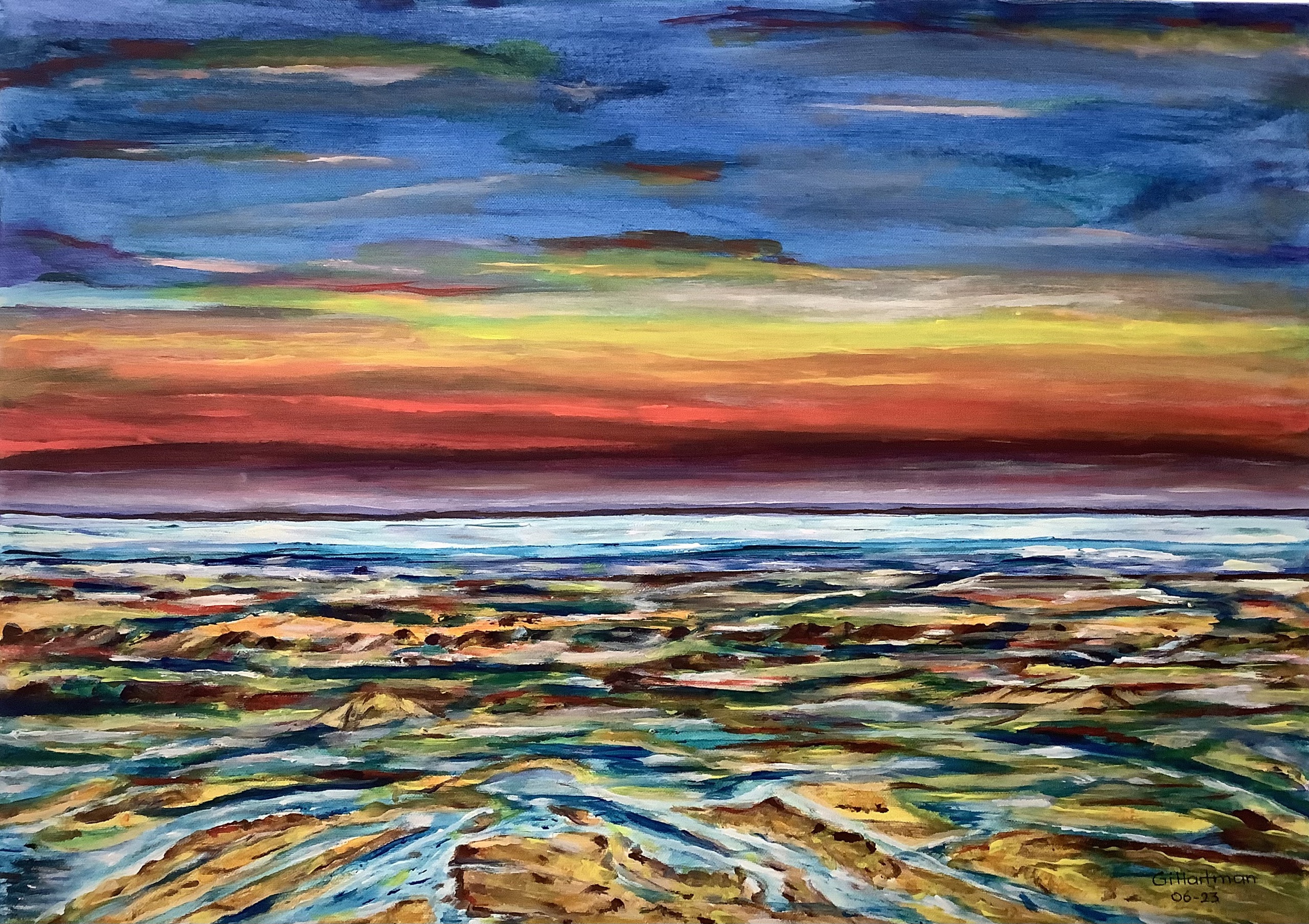 Een kleurrijk schouwspel, tegen de avond trekt het water zich terug. Wat onder water was, wordt nu zichtbaar. Geulen in het zand... De natuur is in beweging...